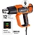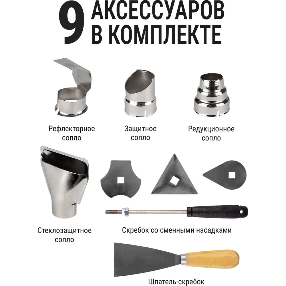 Комплектация Фен; Насадки: редукционное сопло Ø20 мм, рефлекторное сопло, защитное сопло, стеклозащитное плоское сопло, шпатель-скребок, скребок, сменные насадки для скребка: 3 шт; Руководство по эксплуатации; Пластиковый кейс