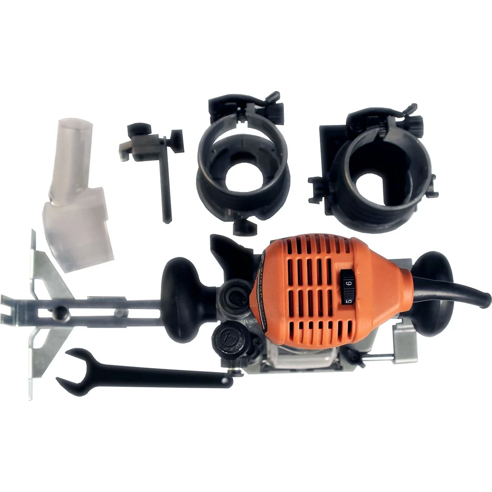 Комплектация Фрезерная машина; Базовое основание; Кромочное основание; Угловое основание; Цанги 8 и 6 мм; Подвижный упор; Регулируемый упор; Специальный ключ; Пылеотвод; Защитный экран; Руководство по эксплуатации; Картонная коробка