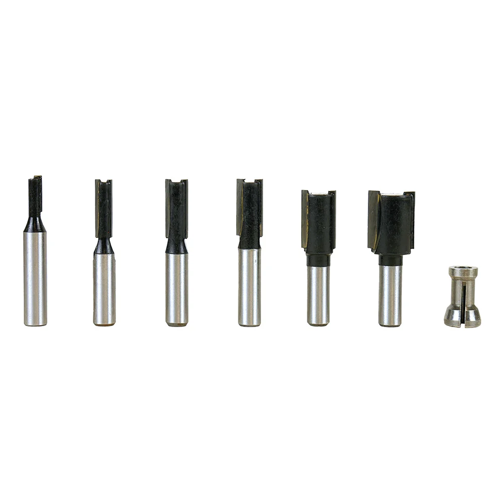 Комплектация Фрезер; Набор фрез - 6 шт; Копировальная втулка; Адаптер для подключения пылесоса; Параллельный упор; Инструкция; Коробка
