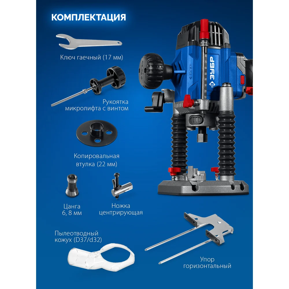 Комплектация Фрезер - 1 шт; Упор горизонтальный - 1 шт; Пылеотводящий кожух - 1 шт; Зажим цанговый (Ø6, 8 мм) - 1 шт; Рукоятка микролифта, винт - 1 шт; Рукоятка дополнительная (установлена) - 1 шт; Кольцо копировальное - 1 шт; Ножка центрирующая - 1 шт; Ключи (гаечный, имбусовый) - 2 шт; Инструкция по эксплуатации - 1 шт