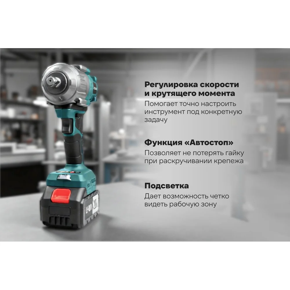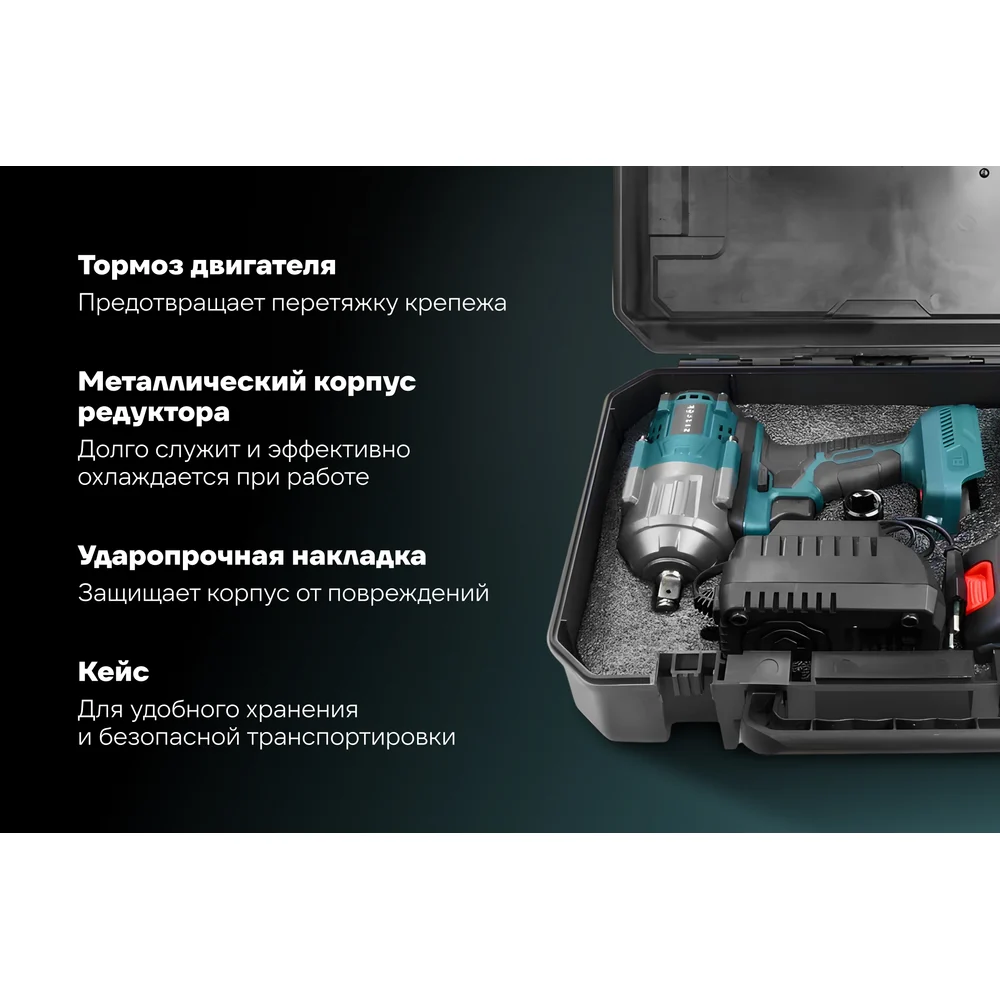 Комплектация Гайковерт аккумуляторный – 1 шт; Аккумулятор – 2 шт; Зарядное устройство – 1 шт; Сменная головка 22 мм– 1 шт; Руководство по эксплуатации – 1 шт; Кейс – 1 шт