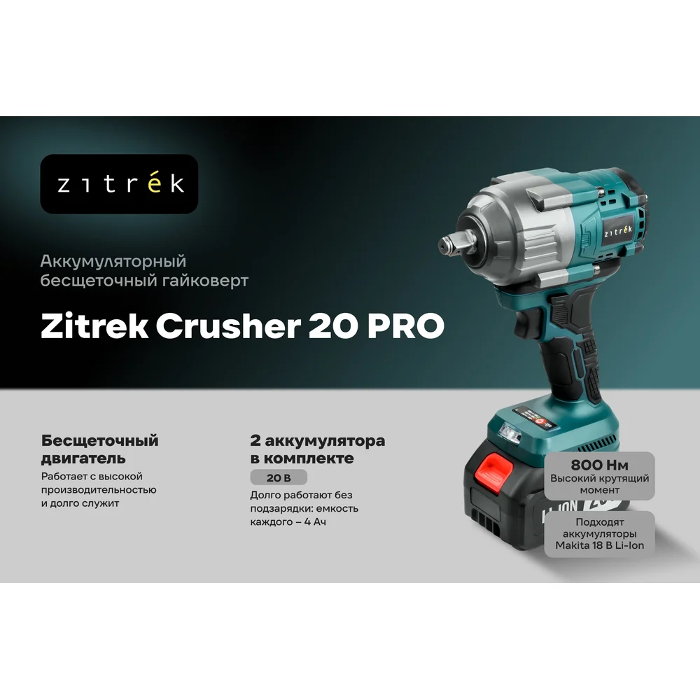 Купить Аккумуляторный бесщеточный гайковерт Zitrek Crusher 20 PRO в кейсе, 20В, 800 Нм, 2x4.0Ач 085-1020 по лучшей цене с доставкой - интернет магазин №1 в России