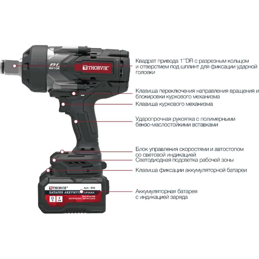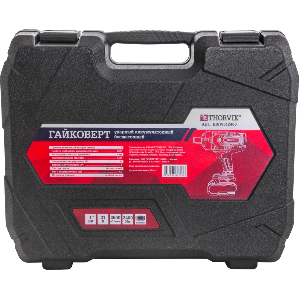 Аккумуляторный бесщеточный ударный гайковерт THORVIK BBIW012400 1DR, 21В, 2400 Нм 053709