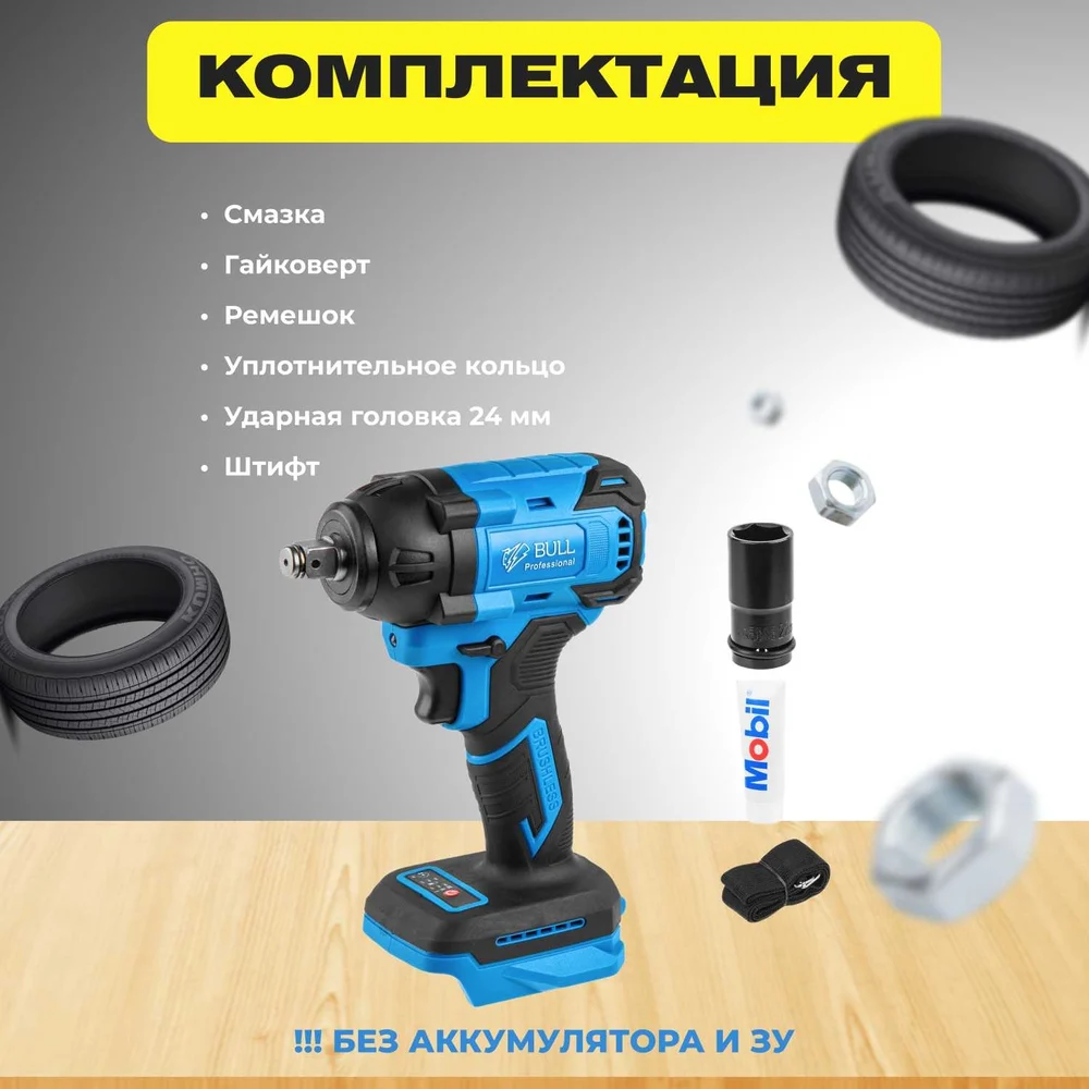 Комплектация Гайковерт; Смазка; Ремешок; Ударная головка 22 мм; Уплотнительное кольцо; Штифт; Инструкция по эксплуатации; Упаковка