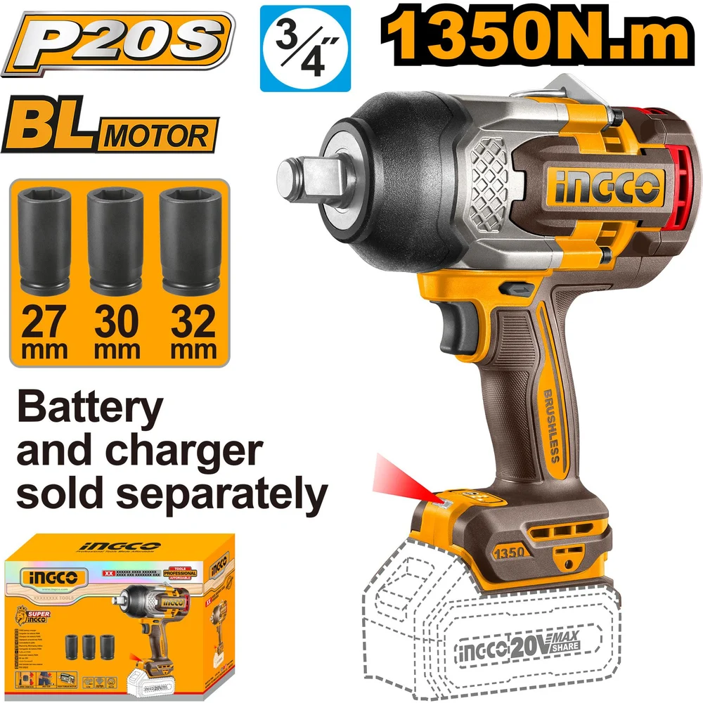 Аккумуляторный ударный гайковерт INGCO 1350 Нм, 3/4, 20В б/щ INDUSTRIA CIWLI201351