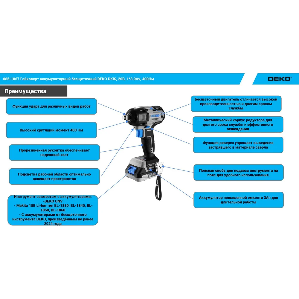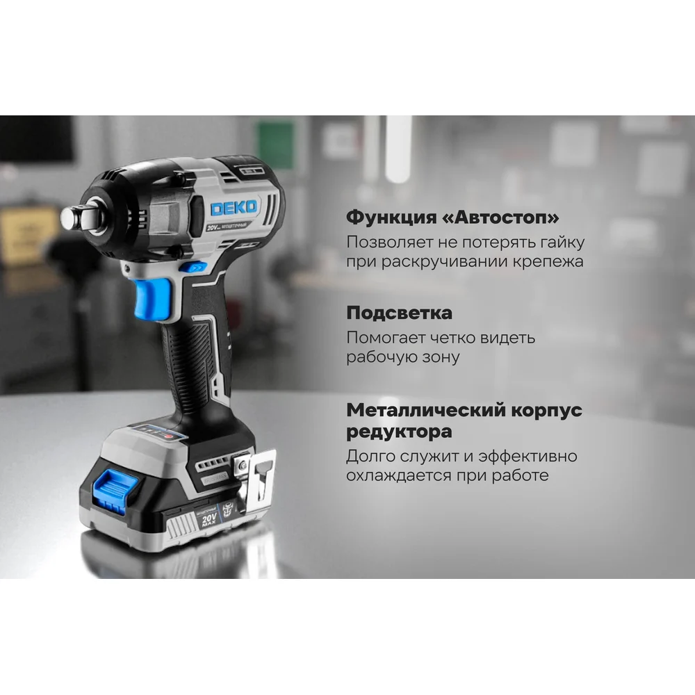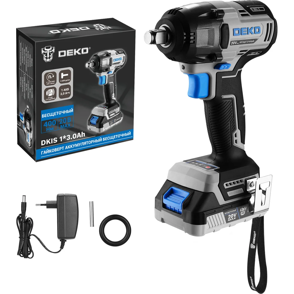 Купить Гайковерт аккумуляторный бесщеточный DEKO DKIS, 20В, 1х3.0Ач, 400Нм 085-1067 по лучшей цене с доставкой - интернет магазин №1 в России