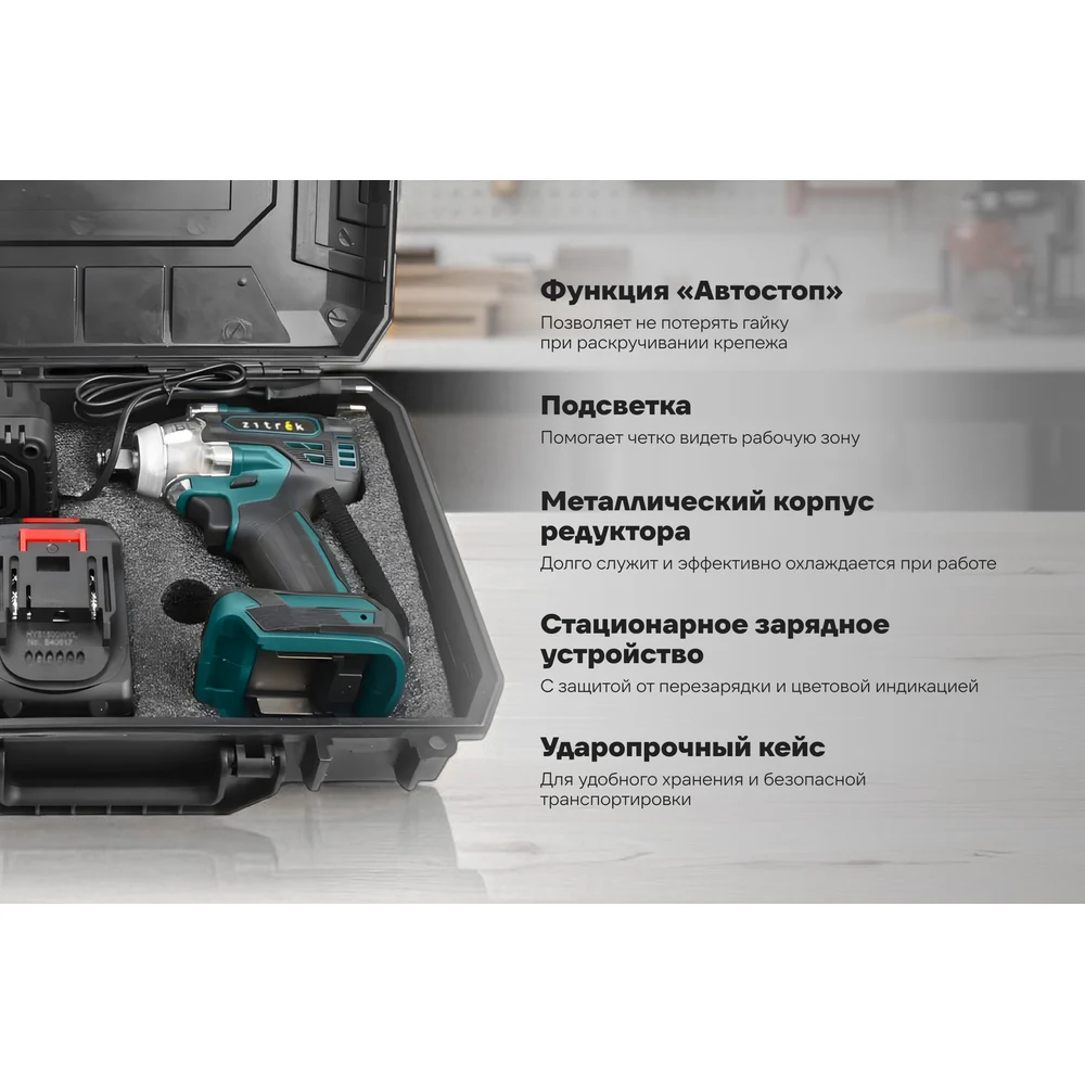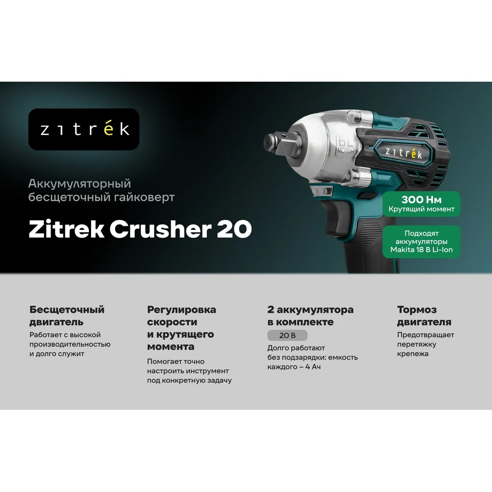 Купить Гайковерт аккумуляторный бесщеточный Zitrek Crusher 20 в кейсе, 20В, 300 Нм, 2x4.0Ач 085-1022 по лучшей цене с доставкой - интернет магазин №1 в России