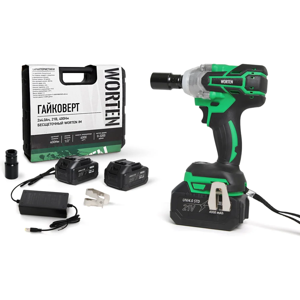 Гайковерт бесщеточный WORTEN 2x4.0Ач, 21В, 400Нм IM КА-90000590