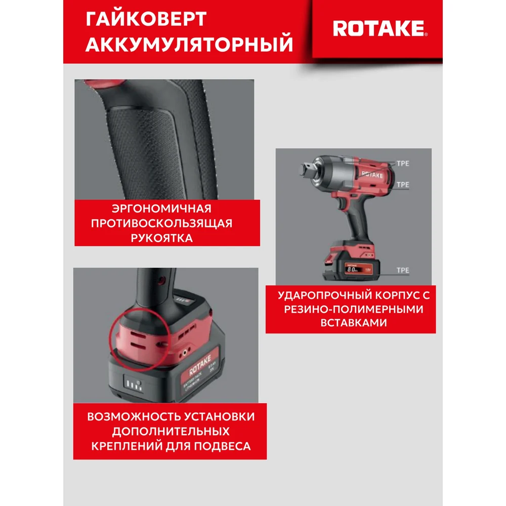 Гайковерт ударный аккумуляторный бесщёточный Rotake 8813 (T3-40D) 1/2DR, 18В, 1880 Нм 014301