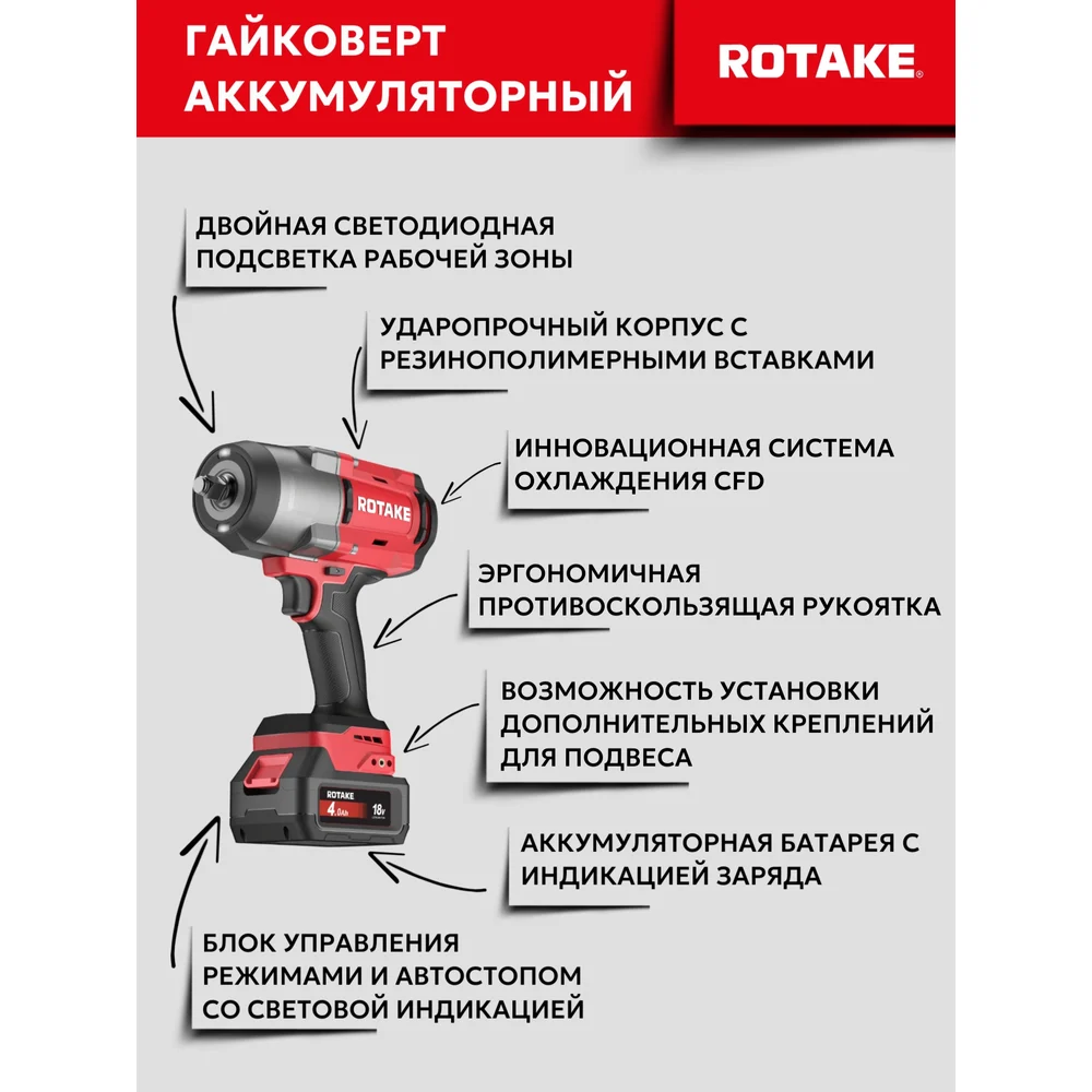 Купить Гайковерт ударный аккумуляторный бесщёточный Rotake 8813 (T3-40D) 1/2DR, 18В, 1880 Нм 014301 по лучшей цене с доставкой - интернет магазин №1 в России