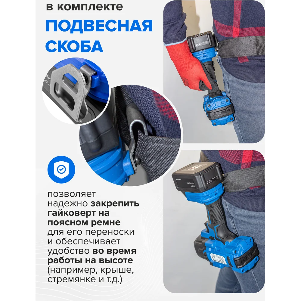 Комплектация Гайковерт ударный аккумуляторный; Зарядное устройство; Аккумуляторные батареи - 2 шт; Ударные глубокие головки - 3 шт. (17, 19, 21 мм)