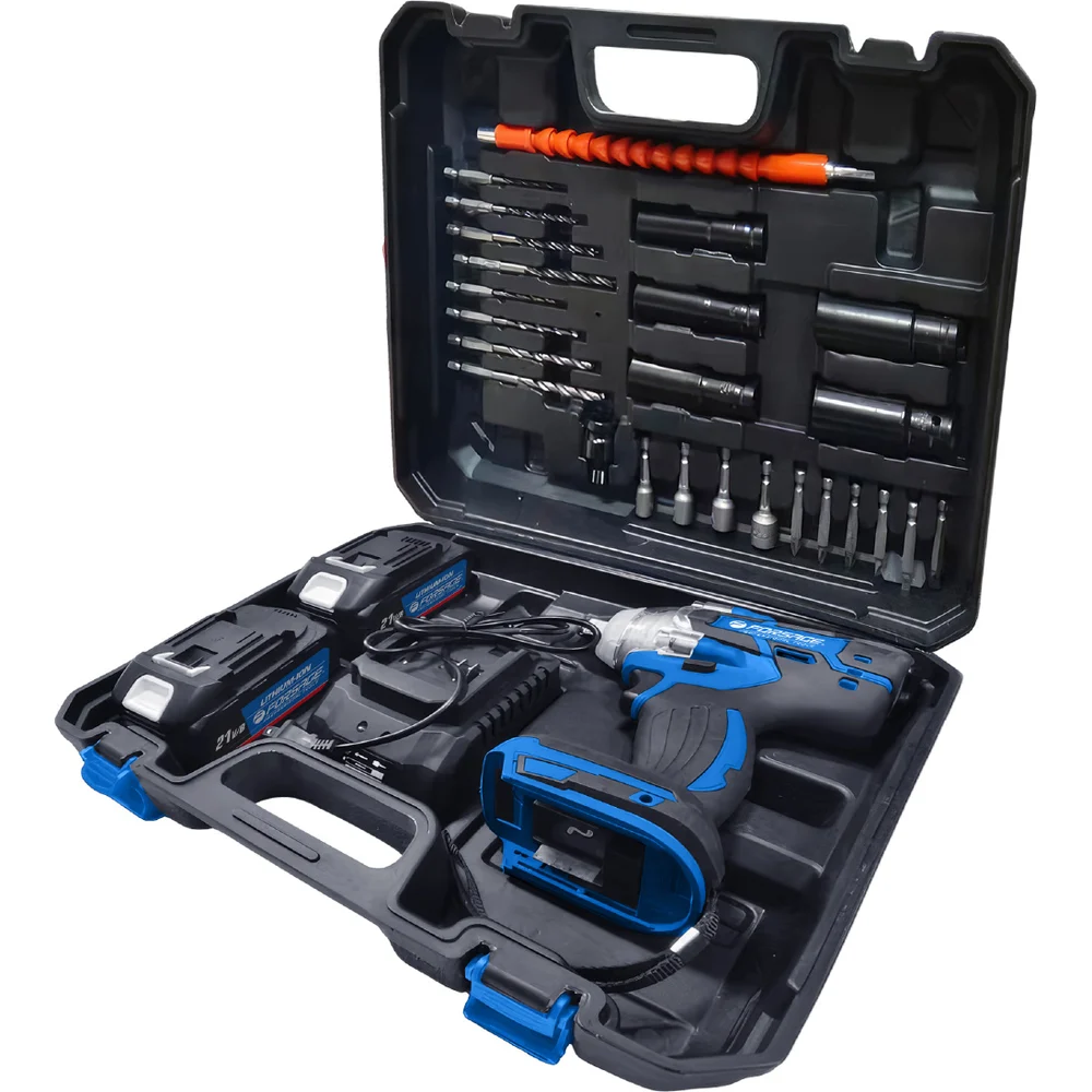 Комплектация Гайковерт; Головки 5шт; Головки-биты 4шт; Двухсторонние биты 6шт; Сверло 8шт; Гибкий удлинитель; Аккумулятор 2шт; Зарядка; Кейс