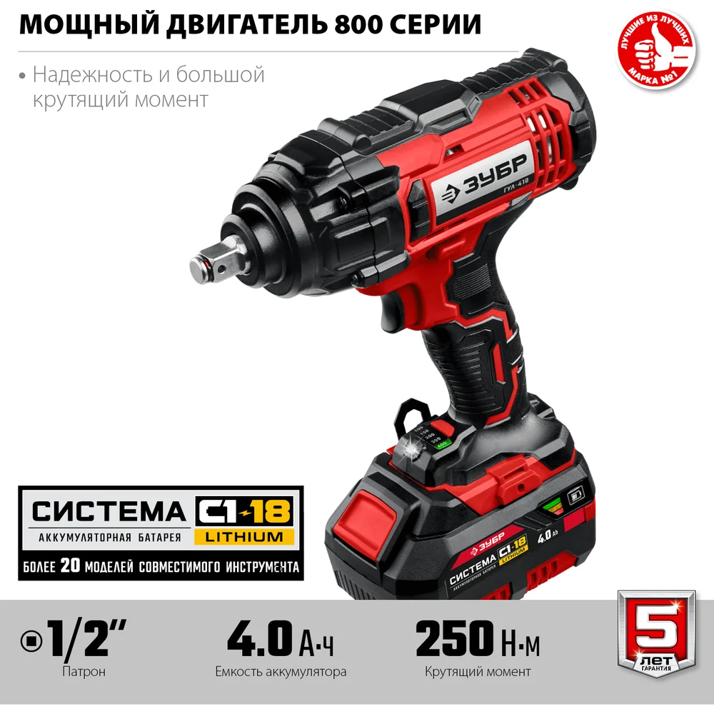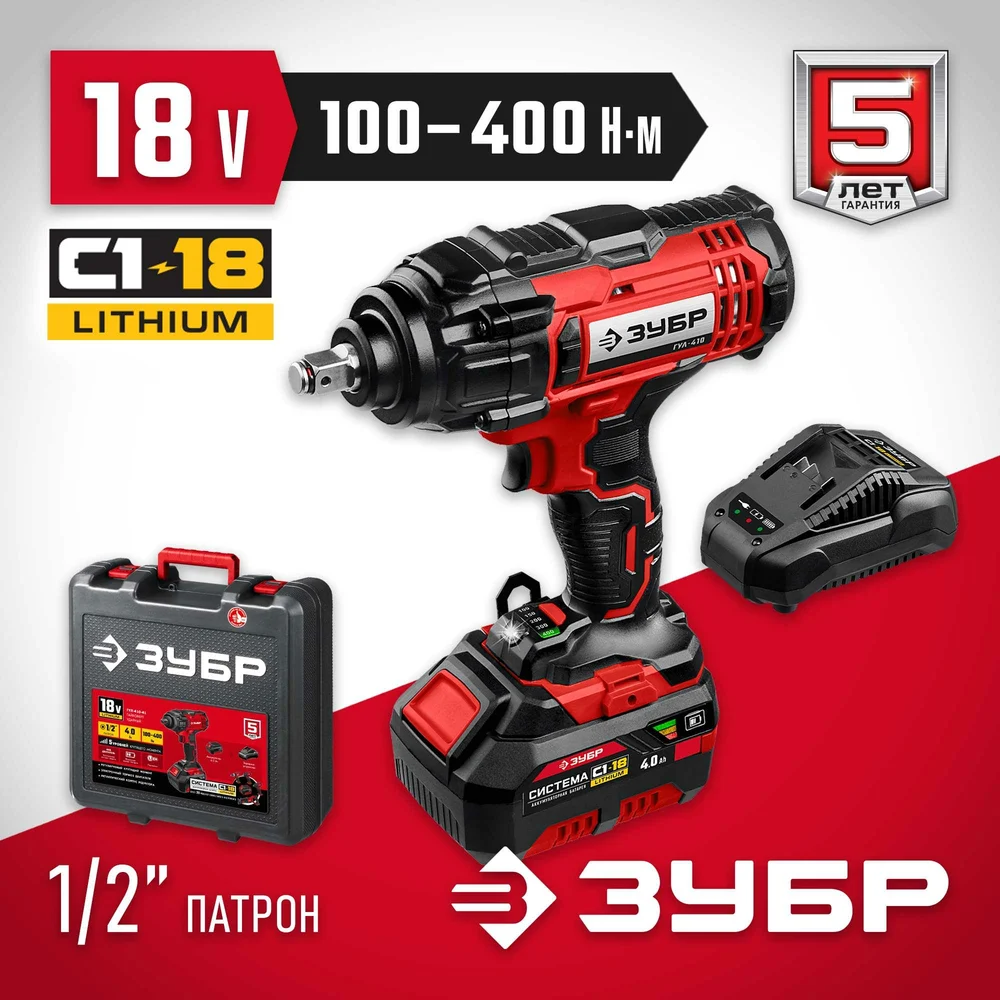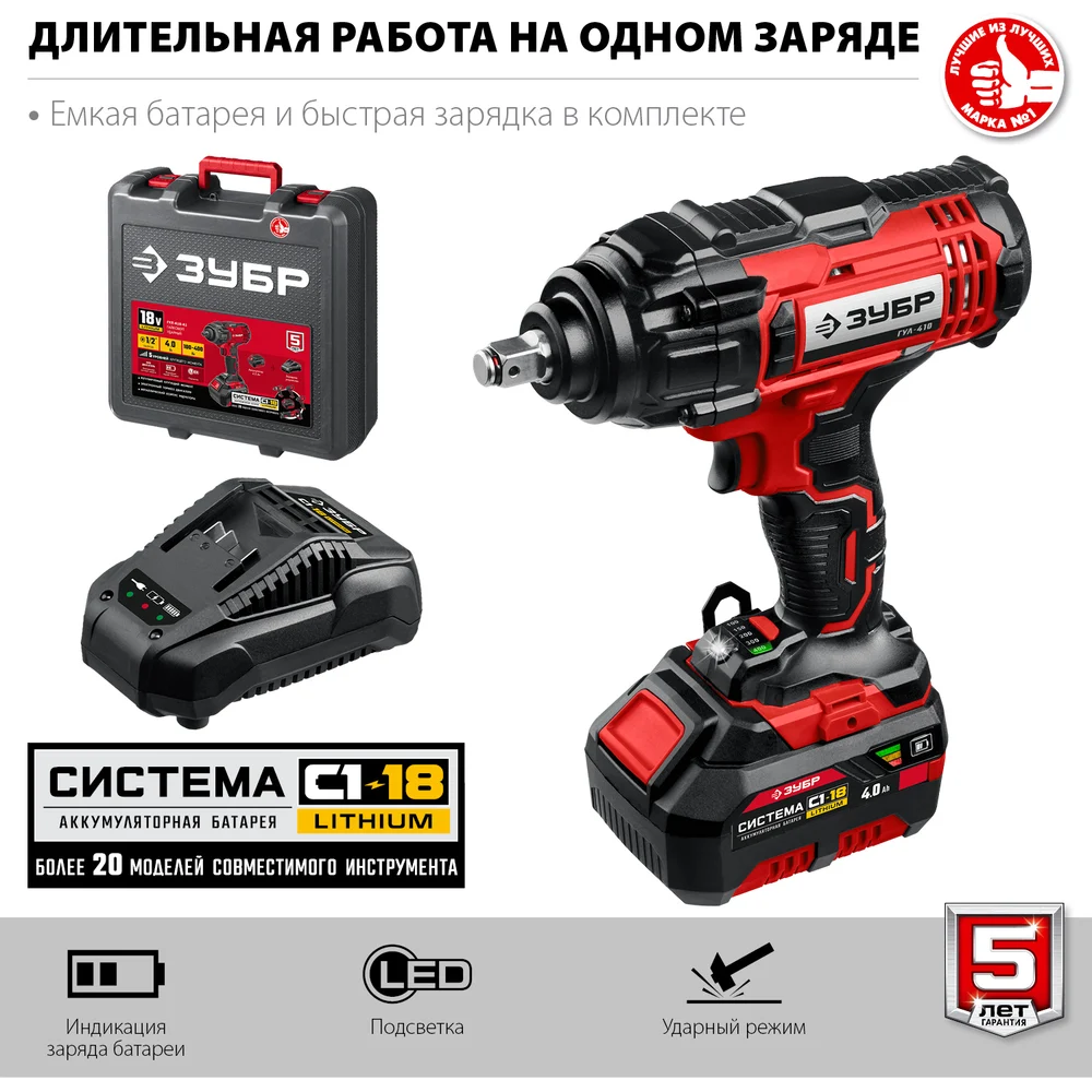 Купить Ударный гайковерт ЗУБР 18В, 1 АКБ ( 4Ач), в кейсе ГУЛ-410-41 по лучшей цене с доставкой - интернет магазин №1 в России