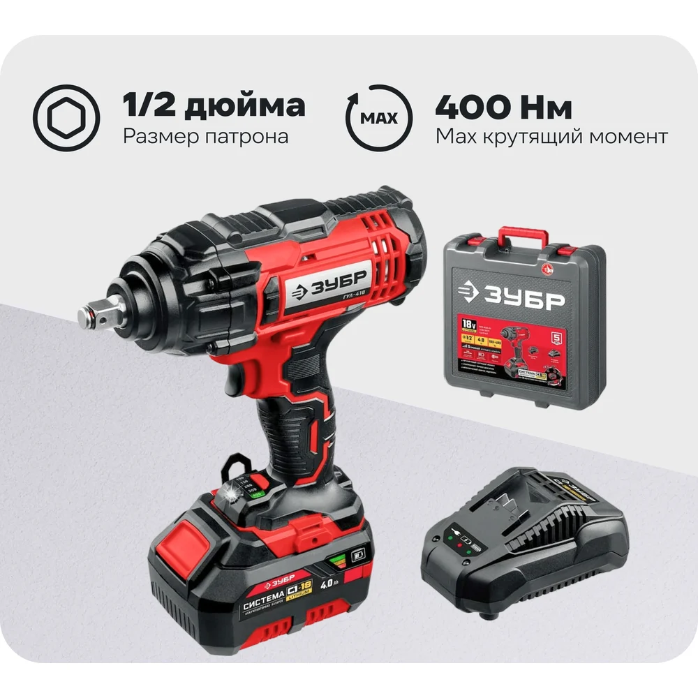 Ударный гайковерт ЗУБР 18В, 1 АКБ ( 4Ач), в кейсе ГУЛ-410-41