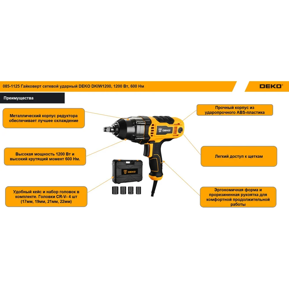 Купить Гайковерт сетевой ударный DEKO DKIW1200, 1200 Вт, 600 Нм 085-1125 по лучшей цене с доставкой - интернет магазин №1 в России