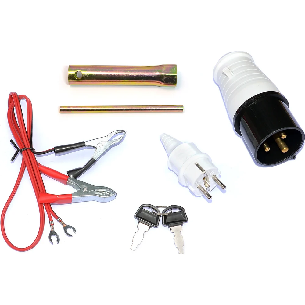 Комплектация Генератор; Аккумулятор; Вилка, для подключения общей нагрузки, 2 шт; Свечной ключ; Колёсный комплект; Инструкция по эксплуатации; Гарантийный талон