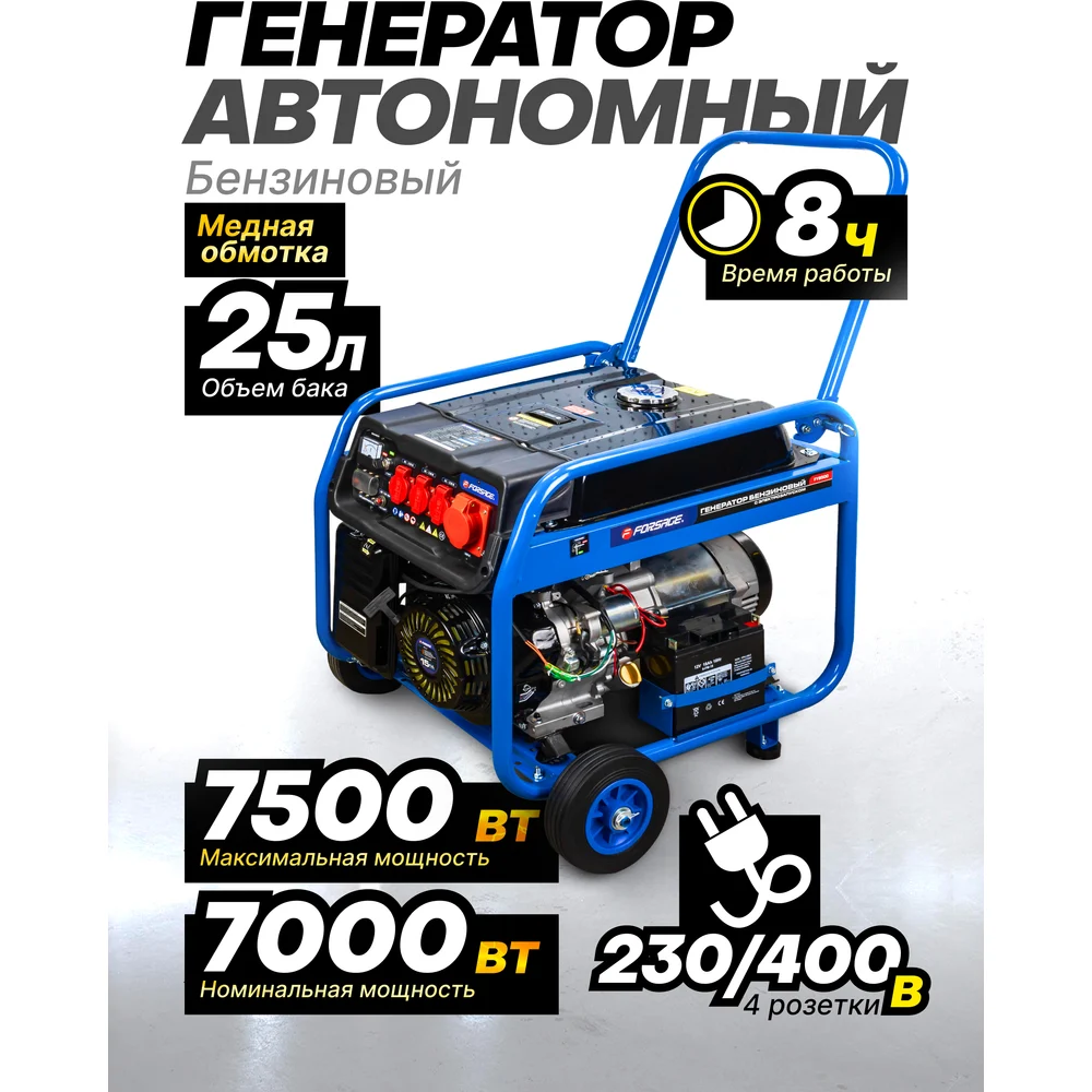 Купить Генератор автономный бензиновый Forsage 2300/7000Вт ном., 3 роз. 220В~50Гц+роз.400В, двиг.15л.с., бак для бензина 25л, бензин АИ-92, время раб. 8ч, шум 97дБ F-FY8500(57992) по лучшей цене с доставкой - интернет магазин №1 в России