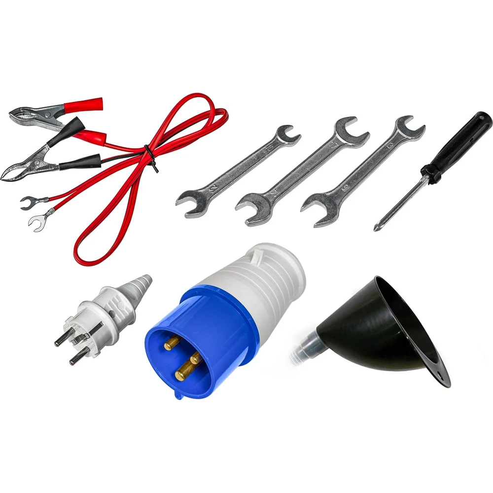 Комплектация Генератор; АКБ; Вилка, для подключения общей нагрузки, 2 шт; Набор проводов для встроенного зарядного устройства; Колёсный комплект; Лейка; Отвёртка; Ключи; Руководство по эксплуатации; Гарантийный талон производителя