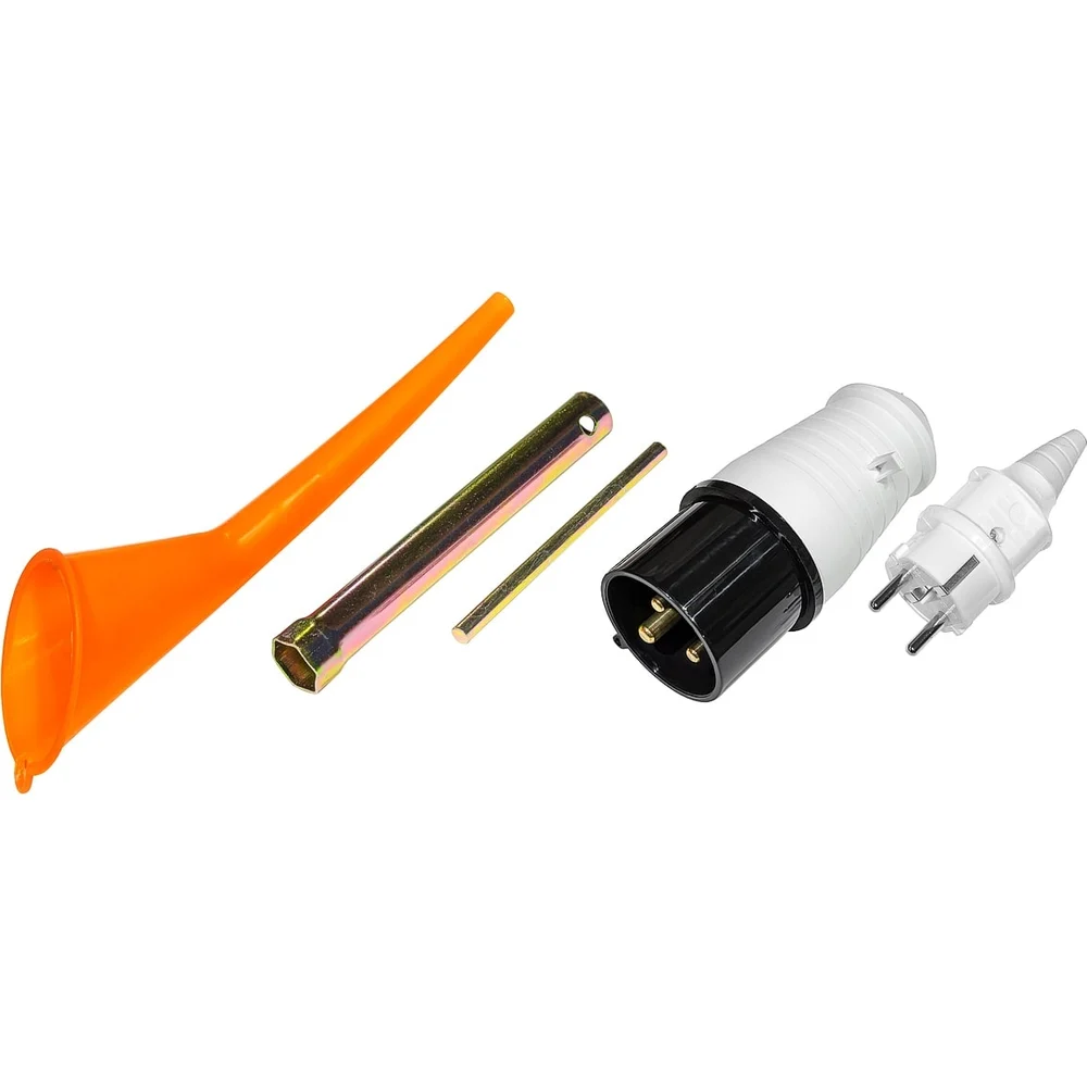 Комплектация Генератор; Колёсный комплект; 2 вилки; Ключ; Воронка; Инструкция по эксплуатации; Гарантийный талон