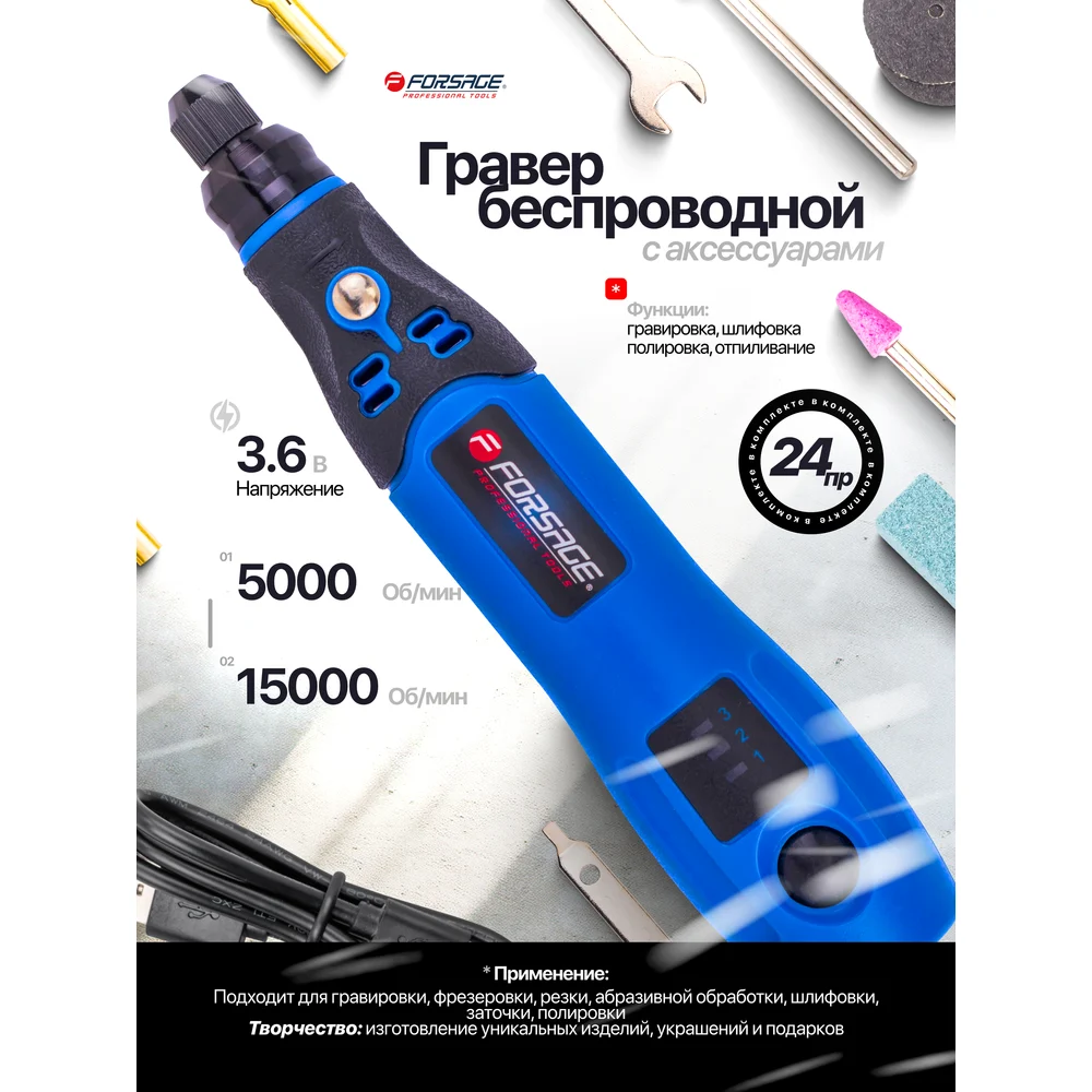 Купить Гравер аккумуляторный Forsage (3.6V, Li-ion 600Ah) в комплекте с насадками, набор 26 предметов F-IXO VI(61454) по лучшей цене с доставкой - интернет магазин №1 в России