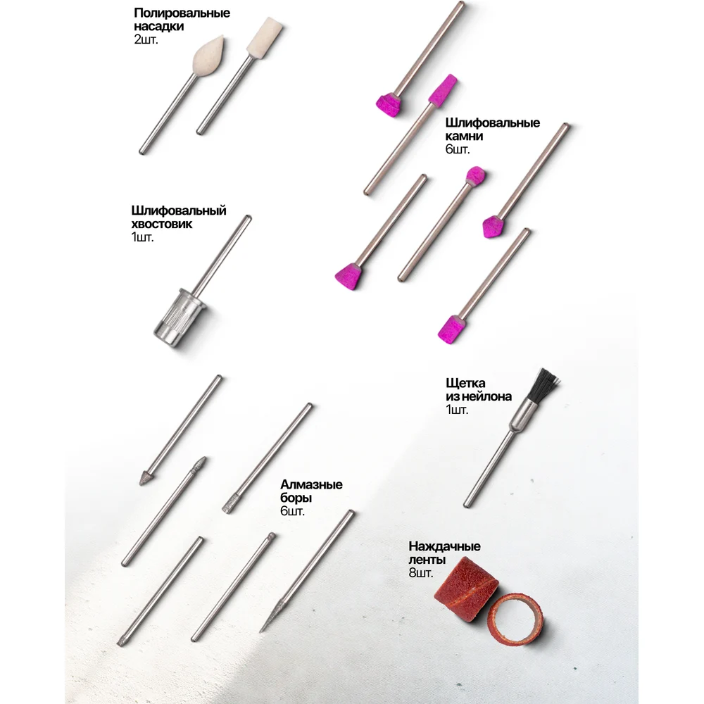 Комплектация Полировальные насадки - 2 шт; Шлифовальные камни - 6 шт; Шлифовальный хвостовик - 1 шт; Алмазные боры - 6 шт; Щетка из нейлона - 1 шт; Наждачные ленты - 8 шт; Блок зарядки + провод USB/Micro USB; Футляр