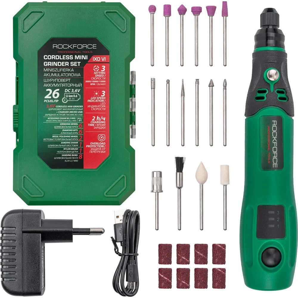 Купить Гравер аккумуляторный Rockforce 3.6V, Li-ion 600Ah в комплекте с насадками, набор 26 предметов RF-IXO VI(61455) по лучшей цене с доставкой - интернет магазин №1 в России