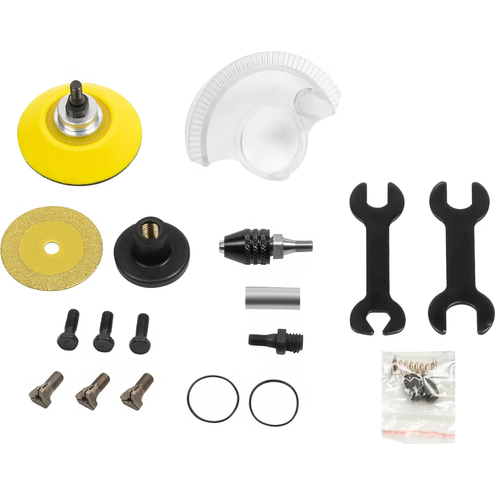 Комплектация Цанги: 2.35/3.0/3.2 мм; Опорная тарелка Ø 30 мм (без липучки); Опорная тарелка Ø 50 мм; Переходник с М4.8 на М7; Диск Ø40х6х8х1.0 мм; Сменные щетки электродвигателя; Болт М4.8 (посадочное Ø 5.8 мм) для крепления оснастки -3шт; Быстрозажимная насадка-патрон; Набор ключей для крепления оснастки; Запасная втулка; Кейс для транспортировки и хранения; Литий-ионный аккумулятор (Li-ion) емкость 2000 mAh и 16,8 V-2 шт; Зарядная станция 16,8 V/2.5A