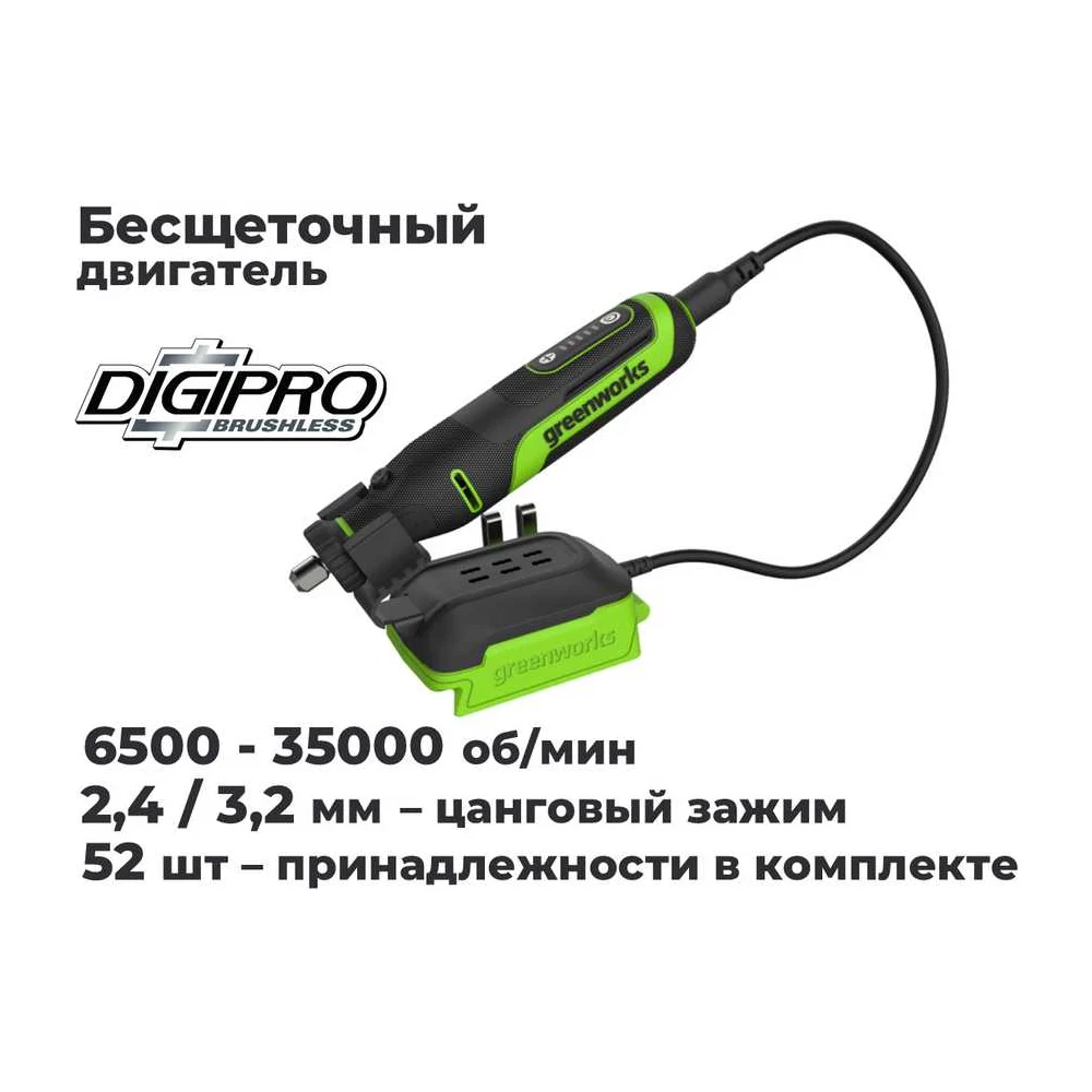 Гравер GreenWorks G24RT, 24V, б/щет, цанги 2.4/3.2мм, 6500–35000 об/мин, оснастка 52 шт, 1x2Ач,ЗУ, сумка, коробка 3200807VUA