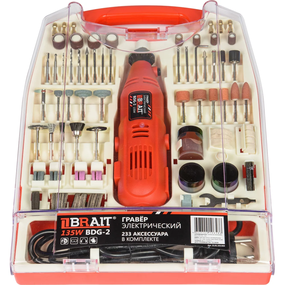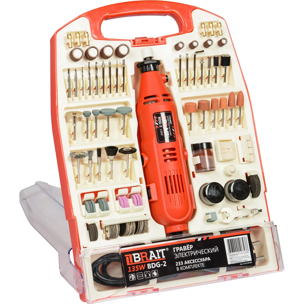 Гравер; Зажимная втулка 2*1,6 мм; 2*2,3 мм; 2*3,2 мм – 6 шт; Шлифовальная лента 12,7*12,7 мм – 4 шт; Шлифовальная лента 6,3*12,7 мм – 4 шт; Алмазная коронка 3,2 мм – 6 шт; Насадка-барабан под отрезной круг 3,2 мм – 2 шт; Насадка-барабан под шлифовальную наждачную бумагу 3,2 мм; Наждачная бумага 12,7*12,7 мм; 6,3*12,7 мм – 2 шт; Шлифовальные круги с наждачной бумагой 3,2 мм – 10 шт; Щётки 3,2 мм – 5 шт; Компаунд; Тканевый круг 25*4,5 мм; Войлочный круг 25,4*6,3 мм – 2 шт; Войлочный круг 12,7*6,3 мм – 4 шт; Войлочный круг 9,5*19 мм; Шлифовальные круги 20*3,2 мм – 12 шт; Наждачный круг 22*4 мм – 2 шт; Наждачная бумага (мелкая) – 30 шт; Наждачная бумага (средняя) – 30 шт; Наждачная бумага (грубая) – 30 шт; Отрезные круги 24*0,4 мм – 36 шт; Отрезные круги (мощный) 24*0,8 мм – 30 шт; Отрезные круги (с алмазным напылением) 32*1,2 мм – 5 шт; Точильный камень; Ключ; Нож; Шпилька; Гибкий вал; Инструкция; Кейс |