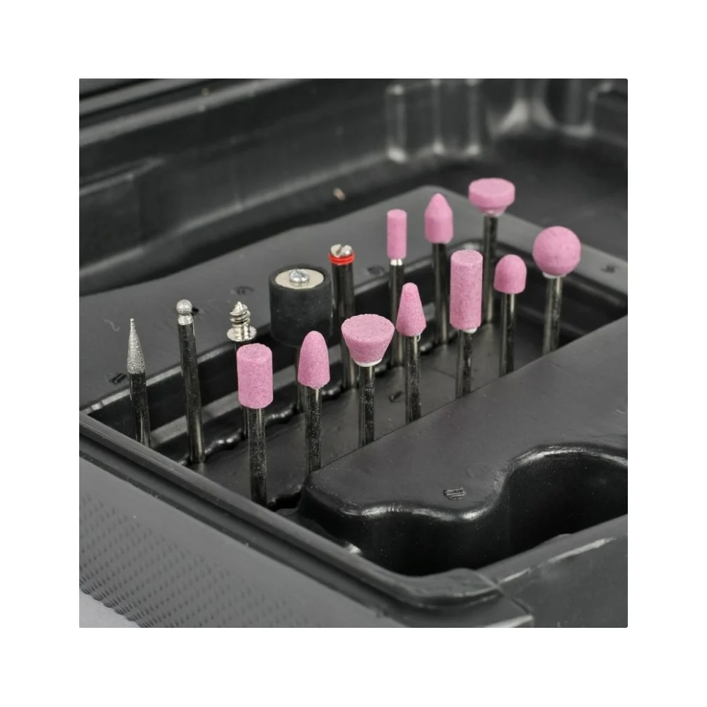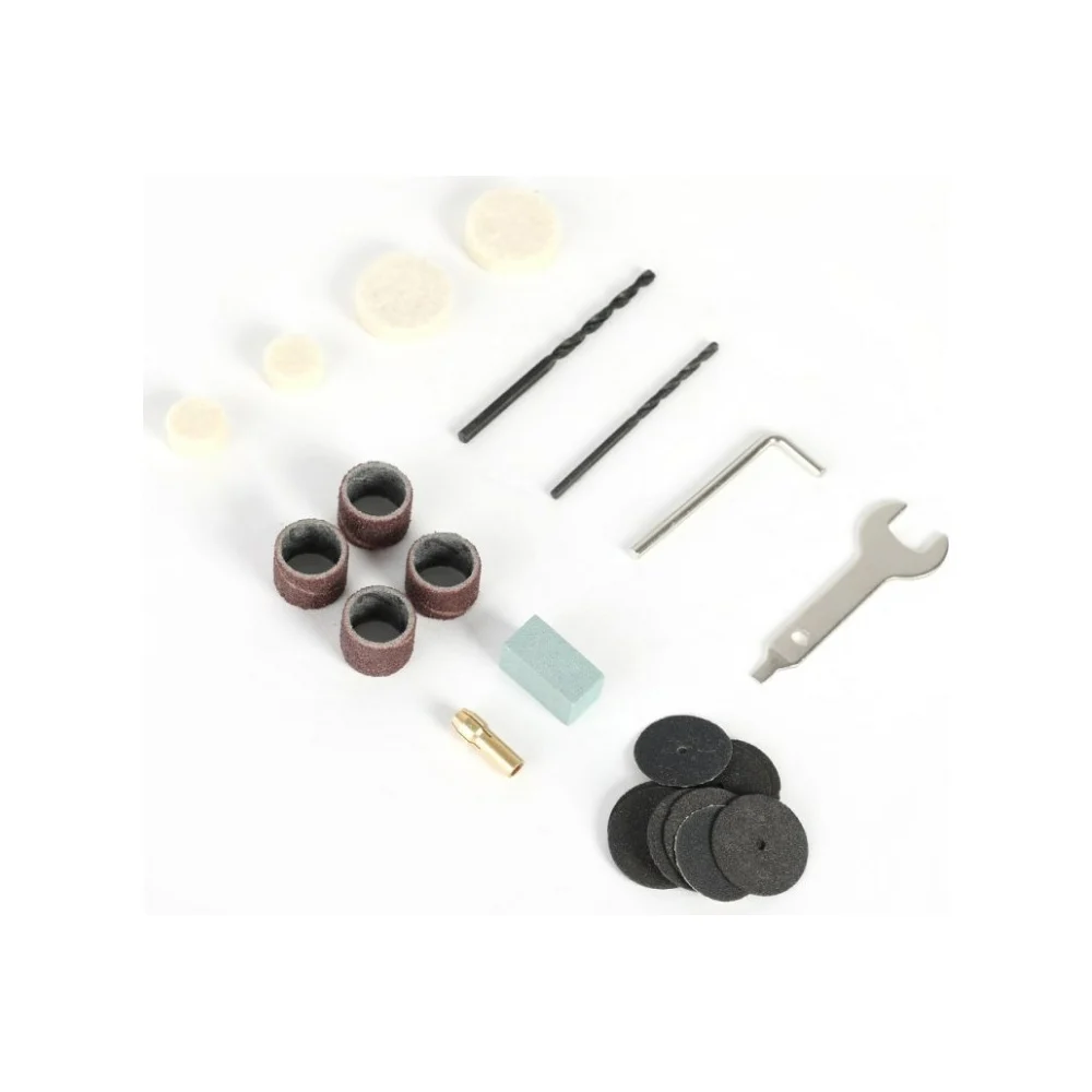 Комплектация Гравер; Гибкий вал; Цанга 2.3 мм; Точильный камень 3.2 мм - 10 шт; Фиксатор цанги; Ключ; Держатель 3.2 мм - 2 шт; Насадка для шлиф. бумаги, ленты 3.2 мм; Шлифовальная лента - 4 шт; Шлифовальная бумага - 4 шт; Отрезной диск - 8 шт; Войлочный полировальный круг - 4 шт; Точильный камень; Сверло 2.3 мм; Сверло 3.2 мм; Алмазная шарошка 3.2 мм - 2 шт; Кейс
