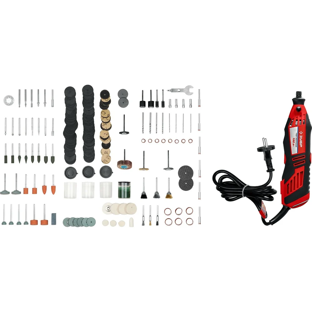 Комплектация Электрическая гравировальная машина; 130Вт, 220В, 50Гц - 1шт; Круги шлифовальные - 30шт; Войлочный полировальный круг - 1шт; Фетровые полировальные круги - 5шт; Державка для фетрового круга - 1шт; Резиновый полировальный круг - 1шт; Сверла по металлу - 3шт; Державки для шлифовальный цилиндров - 2шт; Шарошки алмазные - 4шт; Шарошки металлические - 3шт; Абразивные шлифовальные круги по металлу с хвостовиком - 6шт; Абразивные шлифовальные круги по металлу - 4шт; Абразивные шлифовальные круги по камню с хвостовиком - 4шт; Абразивные шлифовальные круги по камню - 4шт; Щетки-крацовки - 7шт; Паста полировальная - 1шт; Отрезные абразивные круги - 72шт; Шлифовальные круги - 10шт; Цанги хромированные - 4шт; Оправы - 4шт; Отрезные армированные круги - 2шт; Круг лепестковый торцевой - 1шт; Ключ комбинированный монтажный - 1шт; Брусок абразивный правочный - 1 шт; Кейс
