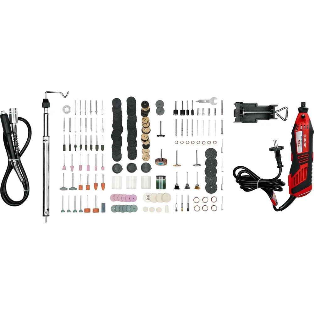 Комплектация Электрическая гравировальная машина; 130Вт, 220В, 50Гц - 1шт; Гибкий вал 105см - 1шт; Подставка для штатива - 1шт.; Штатив - 1шт; Абразивные шлифовальные цилиндры - 14шт; Войлочный полировальный круг - 1шт; Фетровые полировальные круги - 6шт.; Державка для фетрового круга - 1шт.; Резиновый полировальный круг - 2шт.; Сверла по металлу - 8шт; Державки для шлифовальных цилиндров - 4шт.; Шарошки алмазные - 8шт; Шарошки металлические - 3шт; Круг отрезной алмазный - 1шт.; Круг резиновый шлифовальный с хвостовиком - 8шт.; Абразивные шлифовальные круги по металлу с хвостовиком - 12шт; Абразивные шлифовальные круги по металлу - 6шт; Абразивные шлифовальные круги по камню с хвостовиком - 6шт; Абразивные шлифовальные круги по камню - 6шт; Щетки-крацовки - 9шт.; Круги шлифовальные - 45шт; Усиленные отрезные абразивные круги - 30шт; Отрезные абразивные круги - 46шт; Цанги хромированные - 4шт.; Оправы - 9шт; Отрезные армированные круги - 5шт; Круг лепестковый торцевой - 1шт.; Ключ комбинированный монтажный - 1шт.; Брусок абразивный правочный - 1 шт.; Паста полировальная - 1шт; Кейс