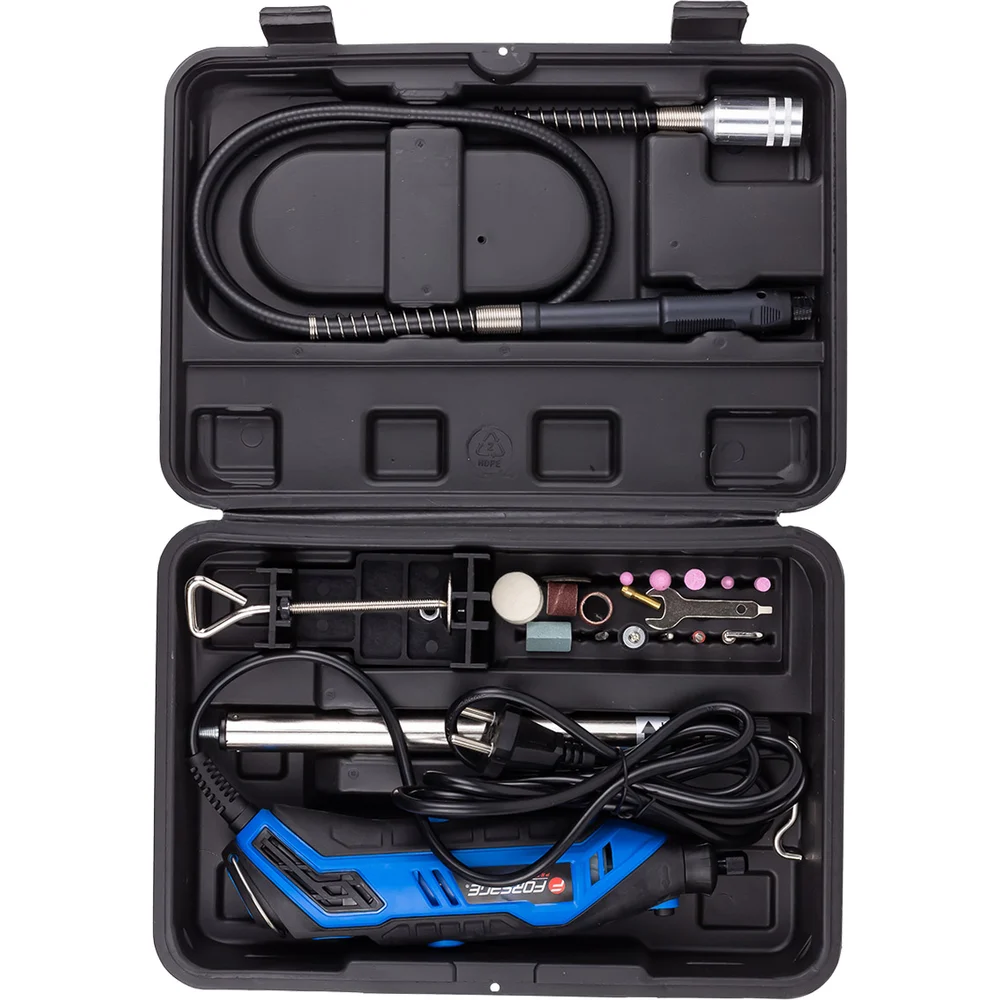 Комплектация Гравер; Круг отрезной 2 шт; Наждачная бумага 2 шт; Шлифовальные круги 5 шт; Шлифовальный хвостовик; Шлифовальная лента 2 шт; Сверло; Алмазный бор; Оправки 2 шт; Фетровые диски 2 шт; Точильный камень; Цанги 2,3/3,2 2 шт; Ключ; Гибкий вал; Штатив; Документация; Пластиковый кейс