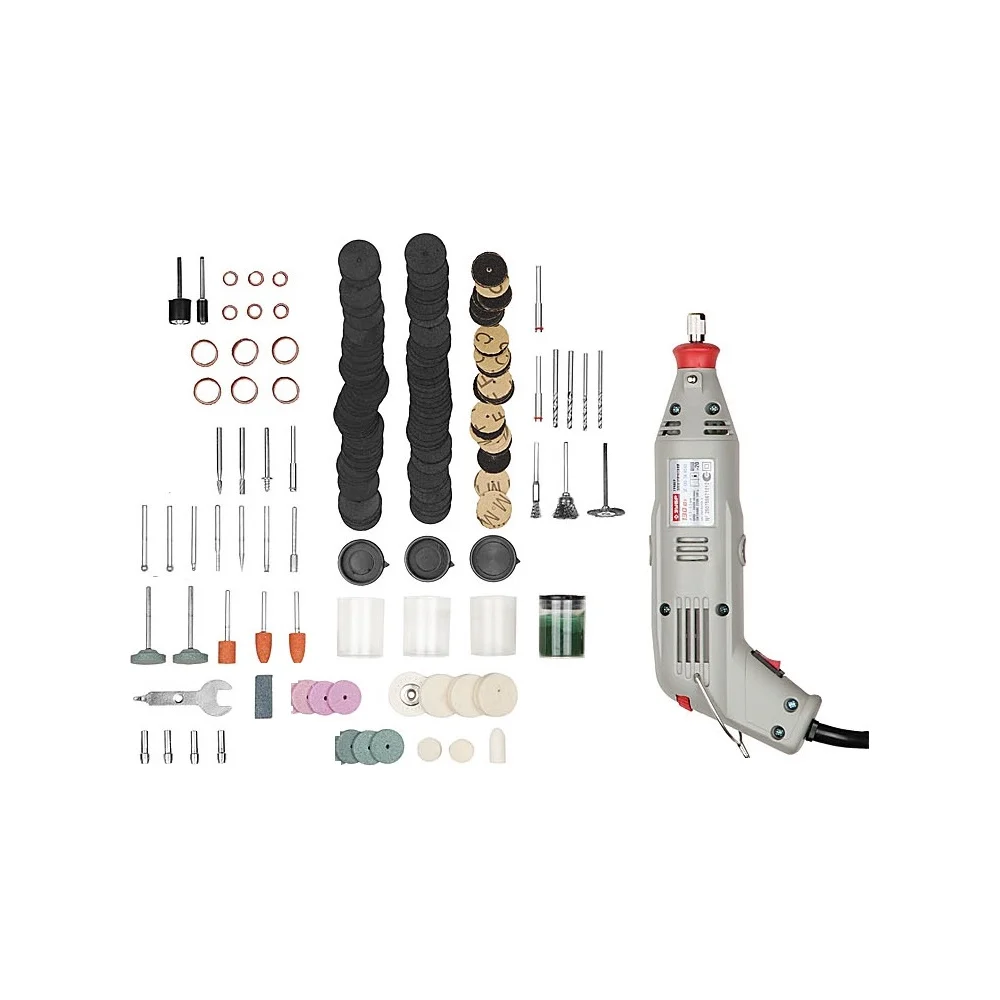 Комплектация Электрическая гравировальная машина; 130Вт, 220В, 50Гц - 1шт; Круги шлифовальные - 12шт; Войлочный полировальный круг - 1шт; Фетровые полировальные круги - 3шт; Державка для фетрового круга - 1шт; Резиновый полировальный круг - 1шт; Сверла по металлу - 4шт; Державки для шлифовальный цилиндров - 2шт; Шарошки алмазные - 5шт; Шарошки металлические - 2шт; Абразивные шлифовальные круги по металлу с хвостовиком - 3шт; Абразивные шлифовальные круги по металлу - 3шт; Абразивные шлифовальные круги по камню с хвостовиком - 2шт; Абразивные шлифовальные круги по камню - 3шт; Щетки-крацовки из нержавеющей стали - 3шт; Паста полировальная - 1шт; Отрезные абразивные круги - 74шт; Шлифовальные круги - 44шт; Цанги хромированные - 4шт; Оправы - 4шт; Ключ комбинированный монтажный - 1шт; Брусок абразивный правочный - 1 шт; Кейс