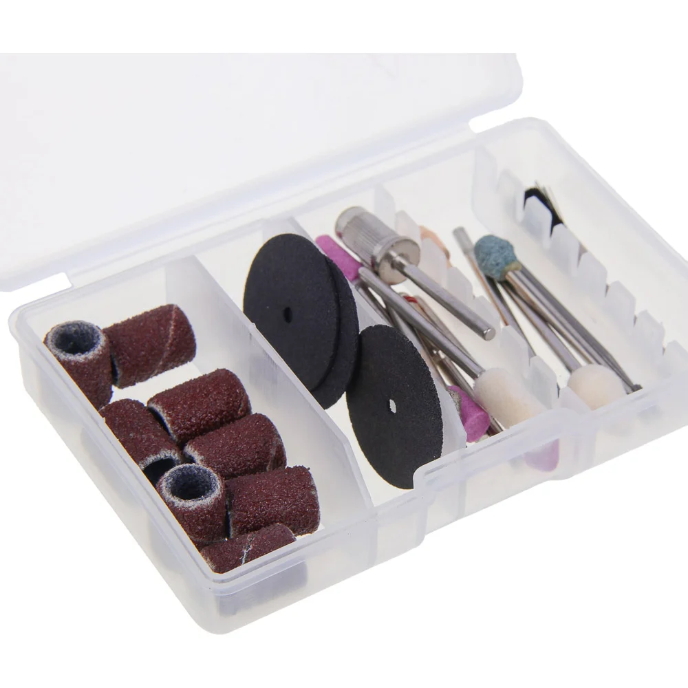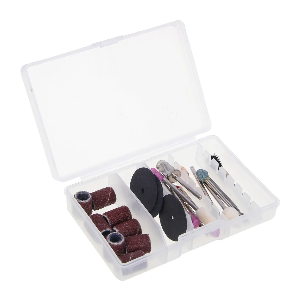 Комплектация Маленькие шлифовальные круги 8 шт; Отрезные диски 3 шт; Шлифовальные головки (силикон-карбидные, 2,3 мм) 6 шт; Алмазные шлифовальные иглы (2,3 мм) 3 шт; Сферические фрезы из быстрорежущей стали (2,3 мм) 2 шт; Нейлоновая щетка (2,3 мм) 1 шт; Цанга (3,2 мм) 1 шт; Оправка для отрезного круга (2,3 мм) 1 шт; Шатун металлический (2,3 мм) 1 шт; Войлочные круги (2,3 мм) 2 шт