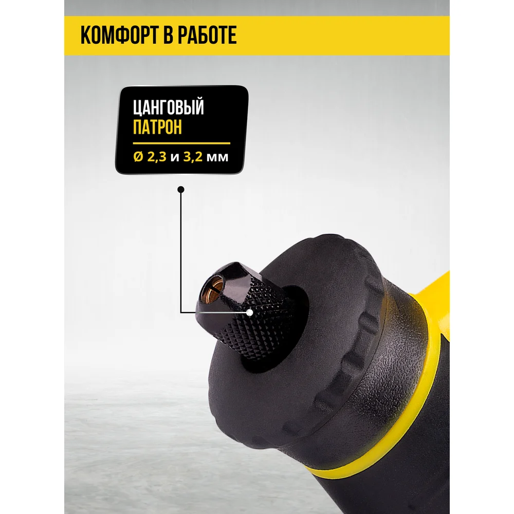 Комплектация гравировальная машина; абразивные насадки (1 уп.); отрезные круги (1 уп.); войлочные круги (1 уп.); наждачные круги (1 уп.); шлифовальная бумага (1 уп.); алмазные насадки (1 уп.); сверла (1 уп.); оправка (1 шт.); цанга (1 шт.); держатель (1 шт.); ключ рожковый (1 шт.); точильный камень (1 уп.); ключ шестигранный (1 шт.); руководство по эксплуатации