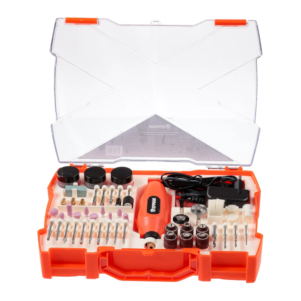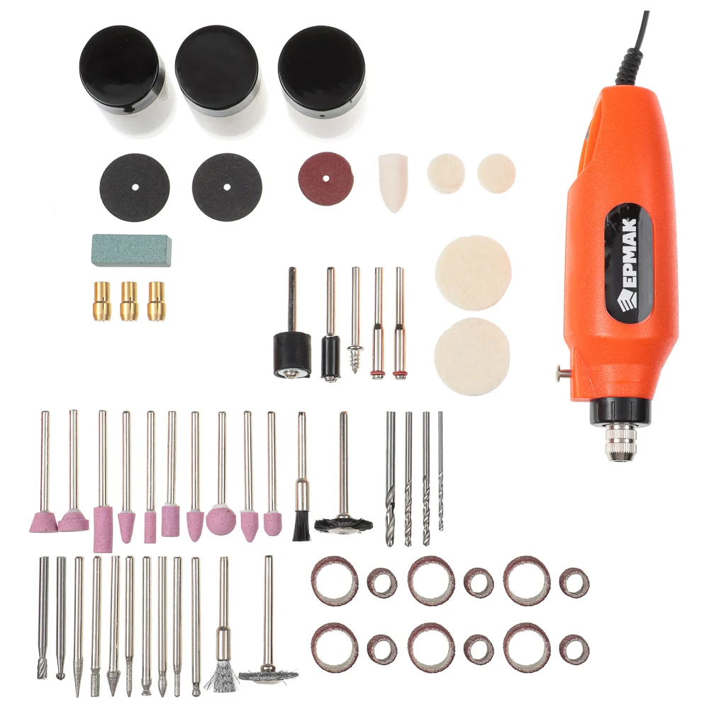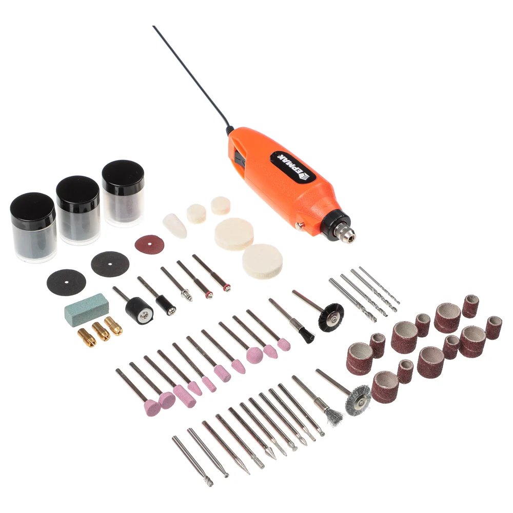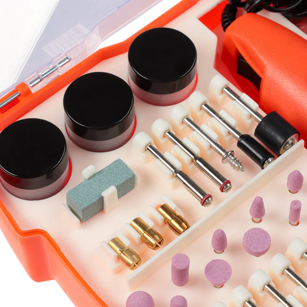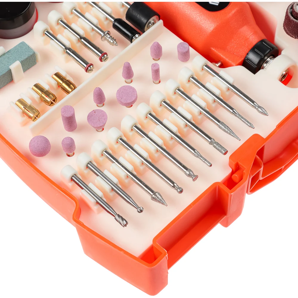 Цанга (1x3,2 мм, 1x2,4 мм, 1x1,6 мм) - 3 шт; Шлифовальная лента (12,7x12,7 мм) - 6 шт; Шлифовальная лента (6,3x12,7 мм) - 6 шт; Шлифовальный камень (3,2 мм) - 10 шт; Оправка для отрезного круга (3,2 мм) - 2 шт; Оправка для войлочного круга (3,2 мм) - 1 шт; Оправка для барабана: (6,3x12,7 мм, 12,7x12,7 мм) - 2 шт; Отделочный камень - 1 шт; Отрезное колесо (24x0,8 мм) - 30 шт; Отрезное колесо (24x0,6 мм) -36 шт; Шлифовальный диск - 40 шт; Войлочное колесо (12,7x12,7 мм) - 2 шт; Войлочное колесо (12,7x6,3 мм) - 2 шт; Войлочный наконечник (9,5*19 мм) - 1 шт; Гравировальный наконечник (3,2 мм) - 2 шт; Алмазный наконечник (3,2 мм) - 8 шт; Сверло (1x1.6 мм, 2x2.3 мм, 1x3.2 мм) - 4 шт; Стальная щетка (3,2 мм) - 2 шт; Щетка (3,2 мм) - 2 шт |