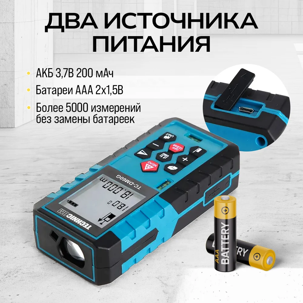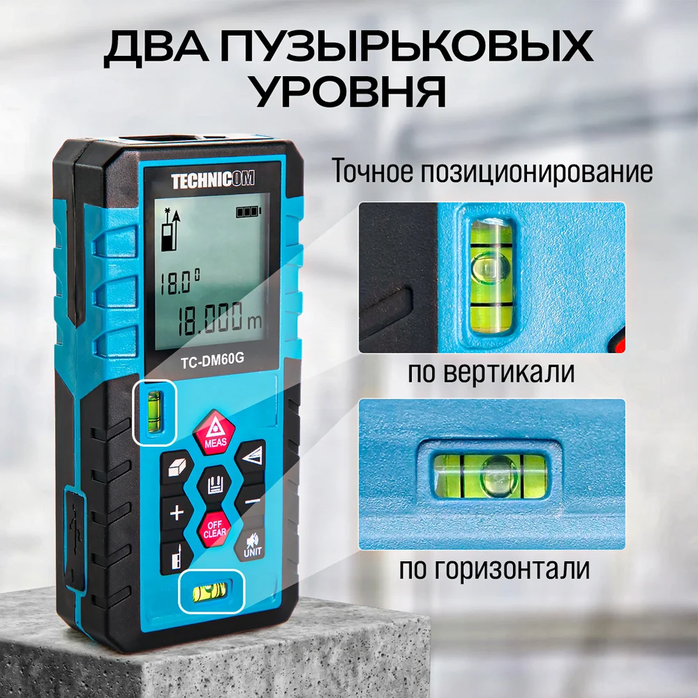 Лазерный дальномер-угломер TECHNICOM дальность 60м, два источника питания, цифровой угломер, 2 источника питания, 2 пузырьковых уровня, 3 точки отсчёта TC-DM60G