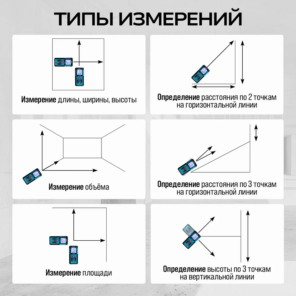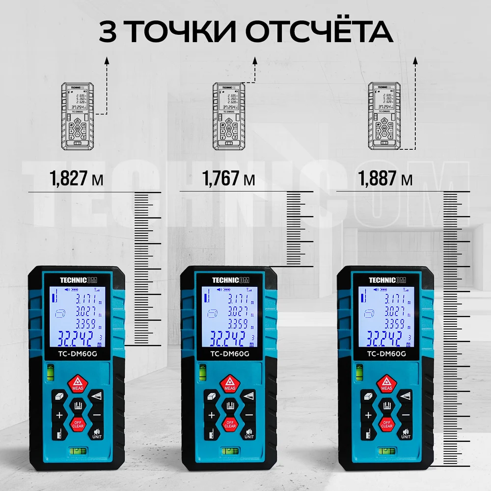 Купить Лазерный дальномер-угломер TECHNICOM дальность 60м, два источника питания, цифровой угломер, 2 источника питания, 2 пузырьковых уровня, 3 точки отсчёта TC-DM60G по лучшей цене с доставкой - интернет магазин №1 в России