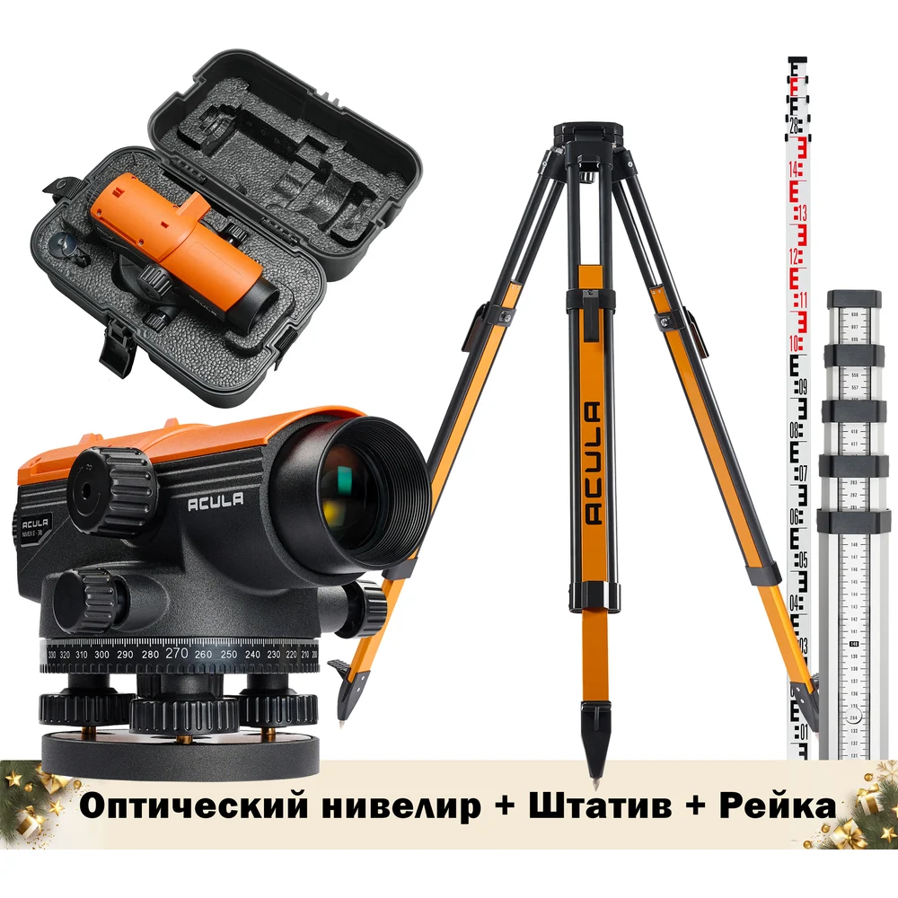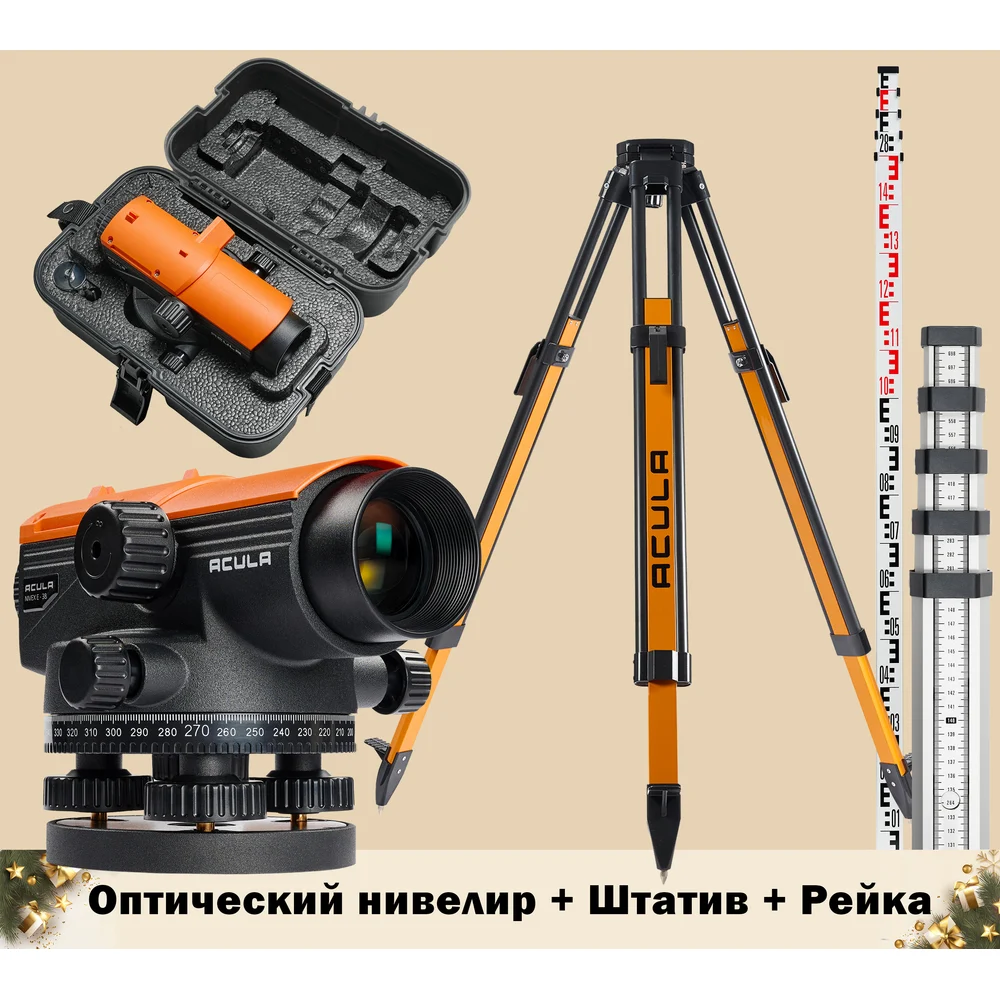 Комплект Оптический нивелир ACULA NIVEX E-38 (кратн.х38; точн.±1.0 мм/км;объектив 36 мм) + Геодезический штатив Geo 12 (высота 99-173 см, фикс. ножек на клипсах, алюминиевый нивелирный, площадка 125 мм, резьба 5/8) + Рейка TLS 5 (5м) LA00173