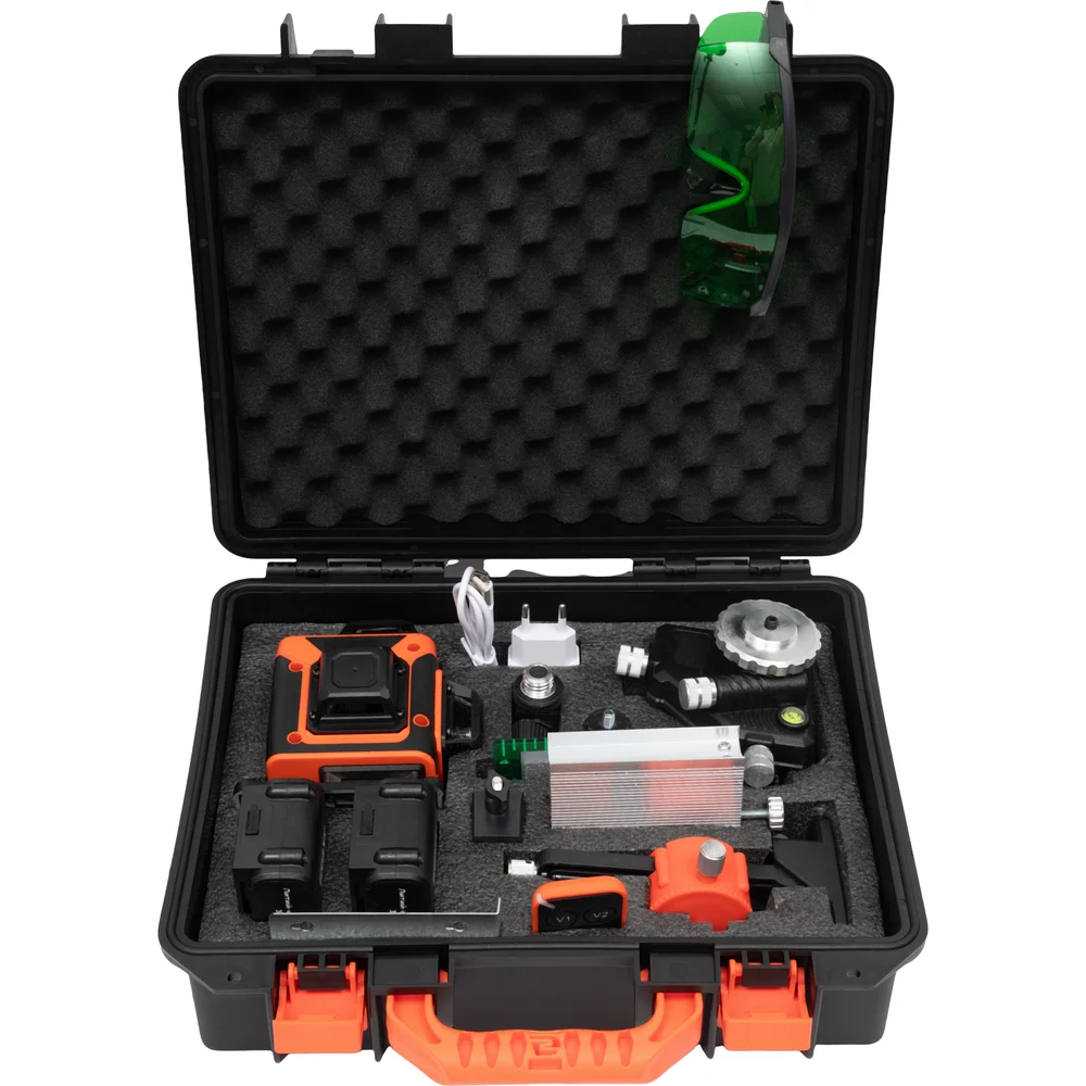 Комплектация Лазерный уровень; Аккумулятор 3000 мАч - 2 шт; Зарядный кабель Type-C; Алюминиевый адаптер; Пластиковый адаптер; Регулируемая алюминиевая подъемная платформа; Настенный крепежный кронштейн; Регулируемое основание; Пульт дистанционного управления; Батарея дистанционного управления; Пластина для лазерной мишени; Очки; Руководство по эксплуатации; Универсальная штанга; Подъемник; Винт для крепления инструмента; Инструкция к телескопической штанге; Пластиковый кейс; Упаковка; Штатив 1.5м; Сумка для штатива; Телескопическая штанга 3.6 м; Сумка для штанги