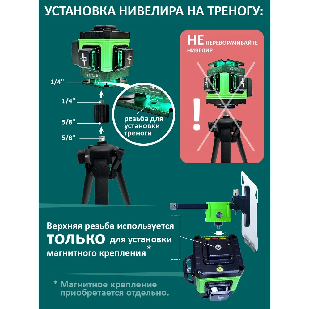 Комплектация Лазерный уровень; Аккумулятор Li-Ion 6000 мач; Противоударная транспортировочная сумка; Зарядное устройство USB; Пульт дистанционного управления; Руководство по эксплуатации изделия и условия гарантийных обязательств, гарантийный талон