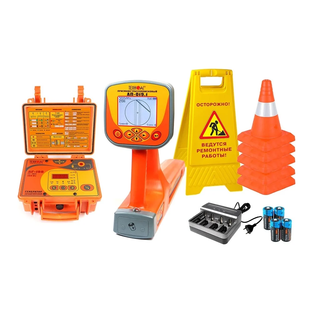 Комплектация Трассопоисковый приемник АП-019.1 1 шт; Генератор трассировочный АГ-108 1 шт; Устройство зарядное АГ107.02.010 1 шт; Кабель АГ120.02.020 1 шт; Кабель АГ120.02.050 1 шт; Кабель АГ105.02.020 1 шт; Контакт магнитный АГ120.02.090 2 шт; Штырь заземления АГ110.02.004 2 шт; Батарейки для приемника 4 шт; Комплект аккумуляторов 1 шт; Зарядное устройство 1 шт; Конус дорожный, высота 30 см 5 шт; Аварийный знак Люк открыт или Идут работы 1 шт; Сумка для приемника (чехол 53212) 1 шт; Сумка для комплекта (чехол 53222) 1 шт; Руководство по эксплуатации 3 шт; Паспорт 1 шт