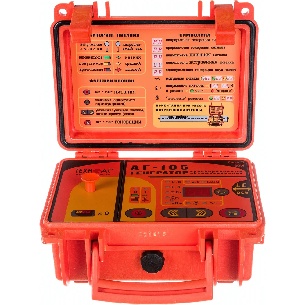 Комплектация Трассопоисковый приемник "АП-019.3"; Генератор "АГ-105"; Батарейки – 12 шт; Кабель USB 2.0 AM-mini USB 1 м; Кабель АГ120.02.020; Кабель АГ120.02.030; Кабель АГ105.02.020; Контакт магнитный АГ120.02.090 – 2 шт; Штырь заземления АГ110.02.004 – 2 шт; Диск CD-R; Сумка для приемника; Сумка для комплекта; Руководство по эксплуатации. Паспорт