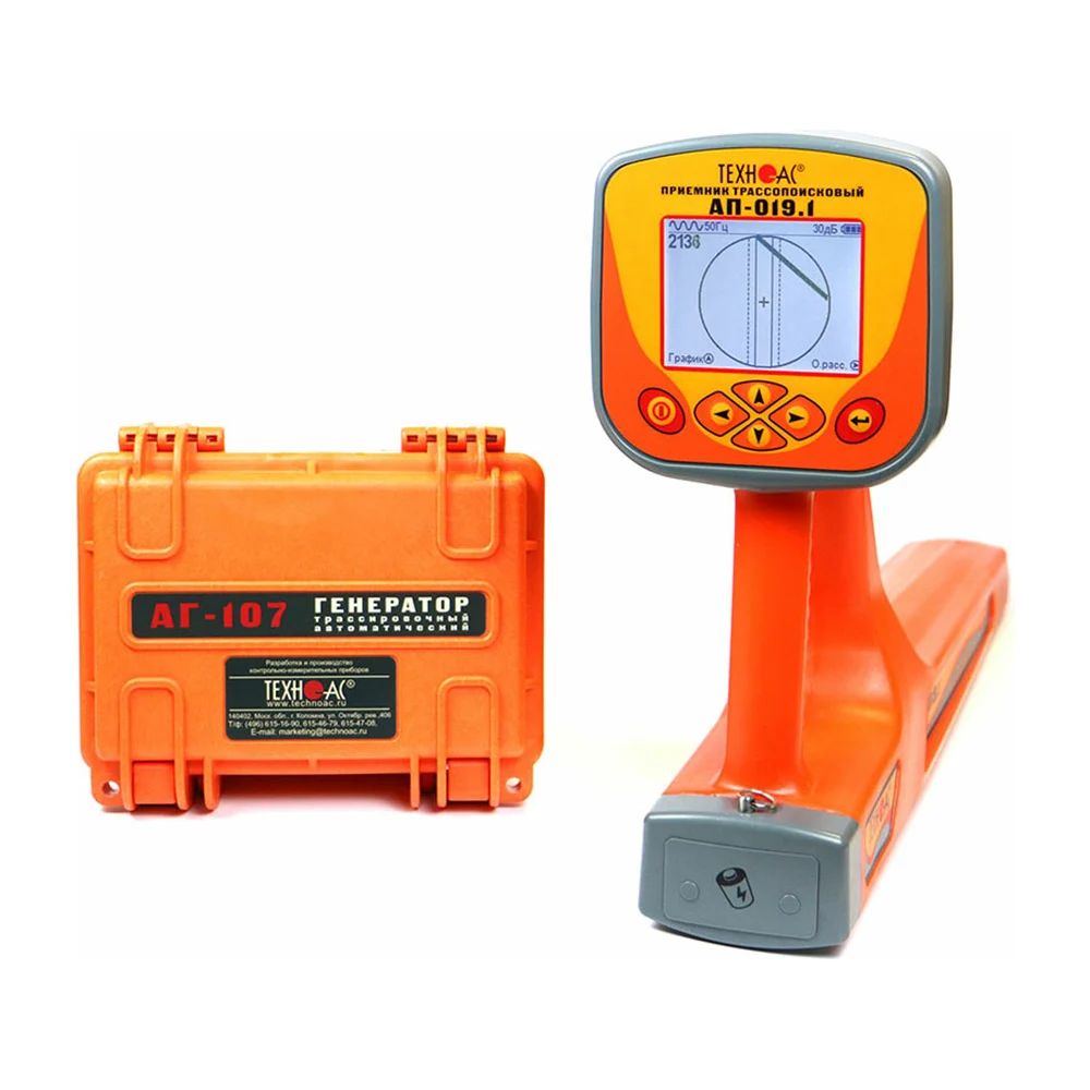 Комплектация Трассопоисковый приемник АП-019.1; Генератор АГ-107; Устройство зарядное АГ107.02.010; Кабель АГ120.02.020; Кабель АГ120.02.050; Кабель АГ105.02.020; Контакт магнитный АГ120.02.090; Штырь заземления АГ110.02.004; Батарейки для приемника; Сумка для приемника (чехол 53212); Сумка для комплекта (чехол 53222); Руководство по эксплуатации; Паспорт