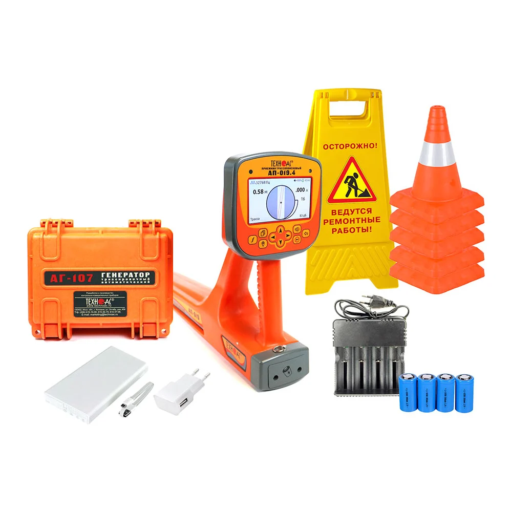 Комплектация Трассопоисковый приемник АП-019.4 1 шт; Генератор трассировочный АГ-107 1 шт; Устройство зарядное АГ107.02.010 1 шт; Кабель АГ120.02.020 1 шт; Кабель АГ120.02.050 1 шт; Кабель АГ105.02.020 1 шт; Контакт магнитный АГ120.02.090 2 шт; Штырь заземления АГ110.02.004 2 шт; Батарейки для приемника 4 шт; Кабель USB 2,0 AM-mini USB 1 м 1 шт; Power bank, 10000 mAh 1 шт; Конус дорожный, высота 30 см 5 шт; Аварийный знак "Люк открыт" или "Идут работы" 1 шт; Зарядное устройство HD-8992A 1 шт; Сумка для приемника (чехол 53212) 1 шт; Сумка для комплекта (чехол 53222) 1 шт; Руководство по эксплуатации 3 шт; Паспорт 1 шт
