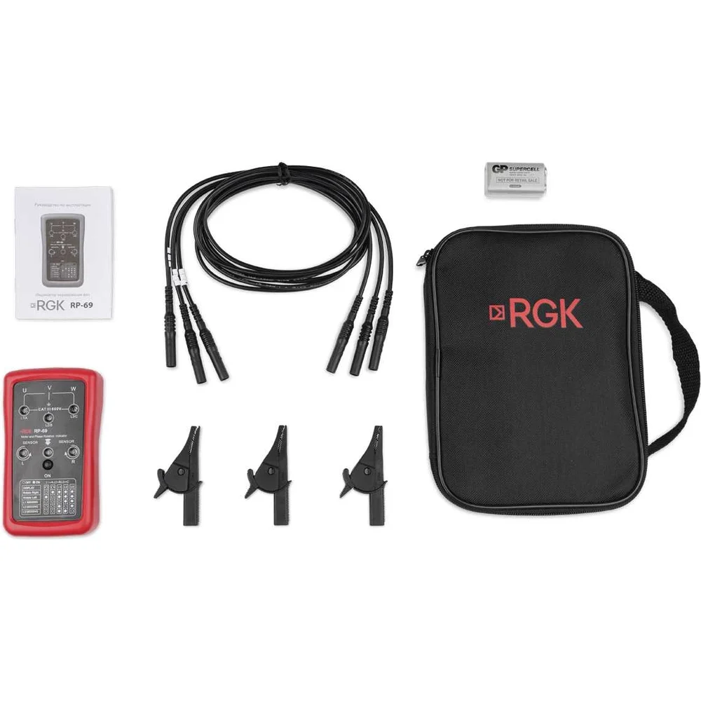 Комплектация Индикатор чередования фаз RGK RP-69; Тестовые провода, 3 шт; Зажимы типа "крокодил", 3 шт; Мягкий чехол; Батарея 9В; Руководство эксплуатации; Упаковка