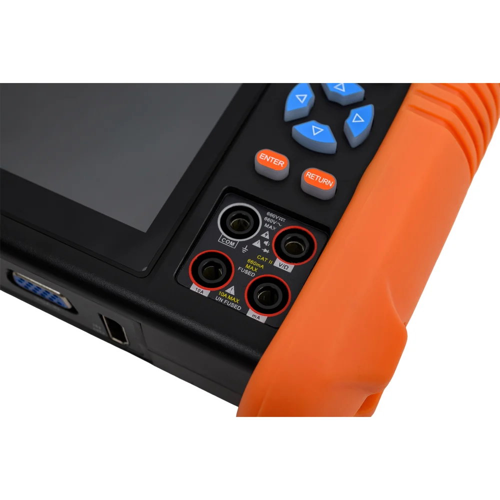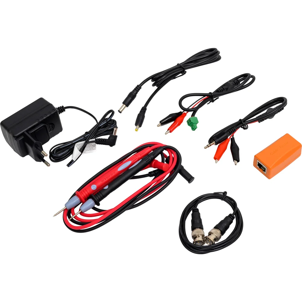 Комплектация Тестер – 1шт; Адаптер питания DC12V/2A – 1шт; Ответная часть для проверки обжимки UTP – 1шт; Литиевая аккумуляторная батарея (7.6V, 7500 мАч, находится в тестере) – 1шт; Кабель BNC-BNC – 1шт; Кабель 2pin-«крокодилы» (RS-485) – 1шт; Кабель DC-DC(5.5х2.1-4х1.7) – 1шт; Кабель TRS 3.5 – «крокодилы» (Аудио) – 1шт; Щупы для мультиметра (опционально) – 2шт; SC, ST оптические коннекторы (опционально) – 1шт; Micro-SD карта памяти 8ГБ – 1шт; Ремешок для тестера – 1шт; Ремешок для бокового удержания – 1шт; Сумка для переноски – 1шт; Руководство по эксплуатации – 1шт; Упаковка – 1шт