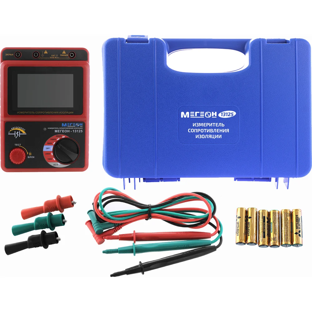 Комплектация 1. Измеритель сопротивления изоляции МЕГЕОН 13125 - 1 шт; 2. Щуп малый - 3 шт; 3. Зажим типа «крокодил» - 3 шт; 4. Батарея 1,5 В типа AA - 6 шт; 5. Кейс - 1 шт; 6. Руководство по эксплуатации - 1 экз