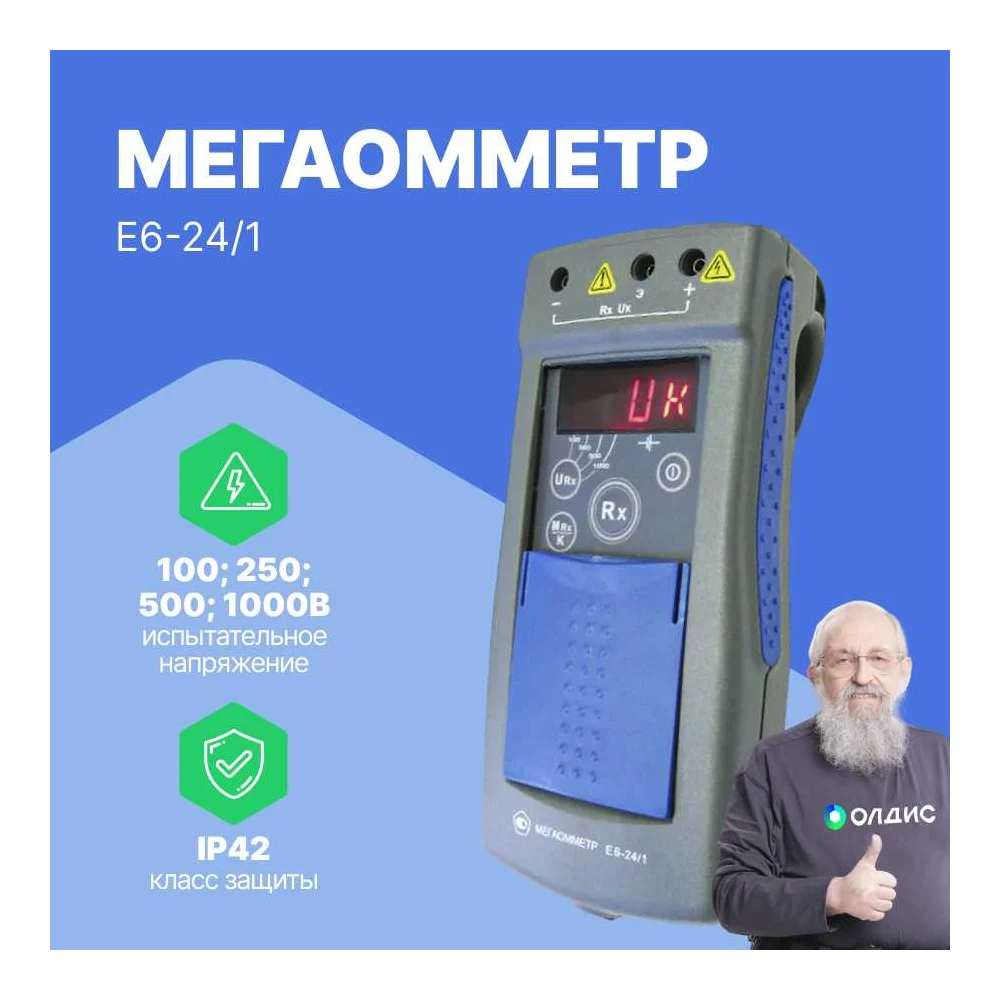 Комплектация Мегаомметр Е6-24/1; Зарядное устройство БПН12-0.5; Батарейный отсек РАПМ.436244.003; Зажим типа «крокодил»; Кабель РЛПА.685551.002 - измерительный, красный, длиной 1,5 м; Кабель РЛПА.685551.002-03 - измерительный, синий, длиной 1,5 м; Кабель РЛПА.685641.002 - соединительный, длиной 1,5 м; Сумка; Руководство по эксплуатации; Упаковка транспортная